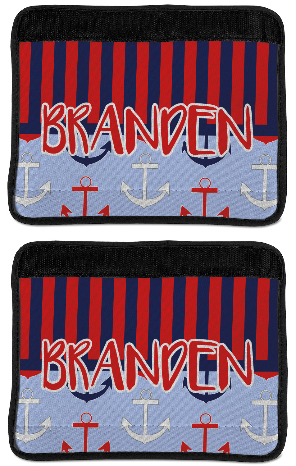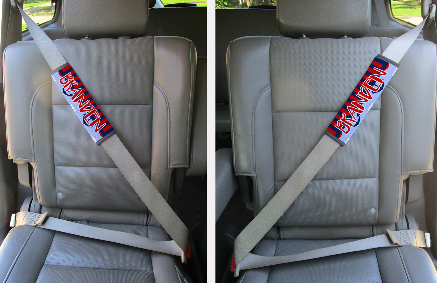 Made from neoprene, our seat belt strap covers wrap around the belt itself and have a Velcro tab for easy attachment and closure. The belt's edges are trimmed with a black polyester for a secure finish. Each cover is 9.5 by 7 inches when open and 9.5 by 2.5 inches when closed. We print your personalized design on the face of the seat belt pad.