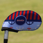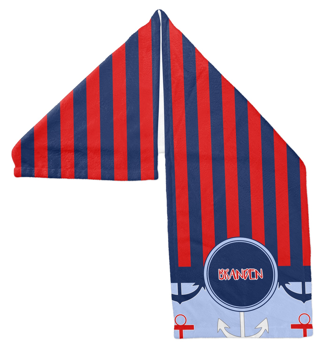 This anchor & stripes pattern is a classic nautical including the colors. We chose the classic nautical red and navy blue striped on top, with anchors in red, white and blue on the bottom. We chose a solid navy ribbon along with a circle label and personalized it with a name.