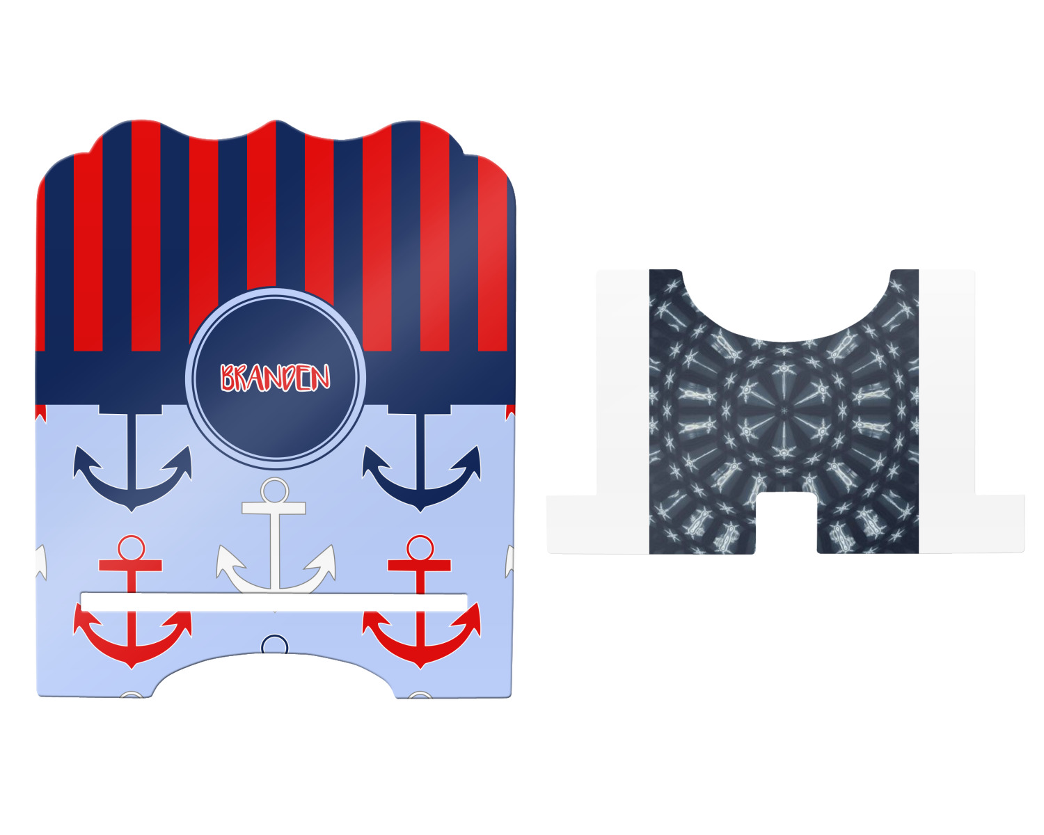 This anchor & stripes pattern is a classic nautical including the colors. We chose the classic nautical red and navy blue striped on top, with anchors in red, white and blue on the bottom. We chose a solid navy ribbon along with a circle label and personalized it with a name.