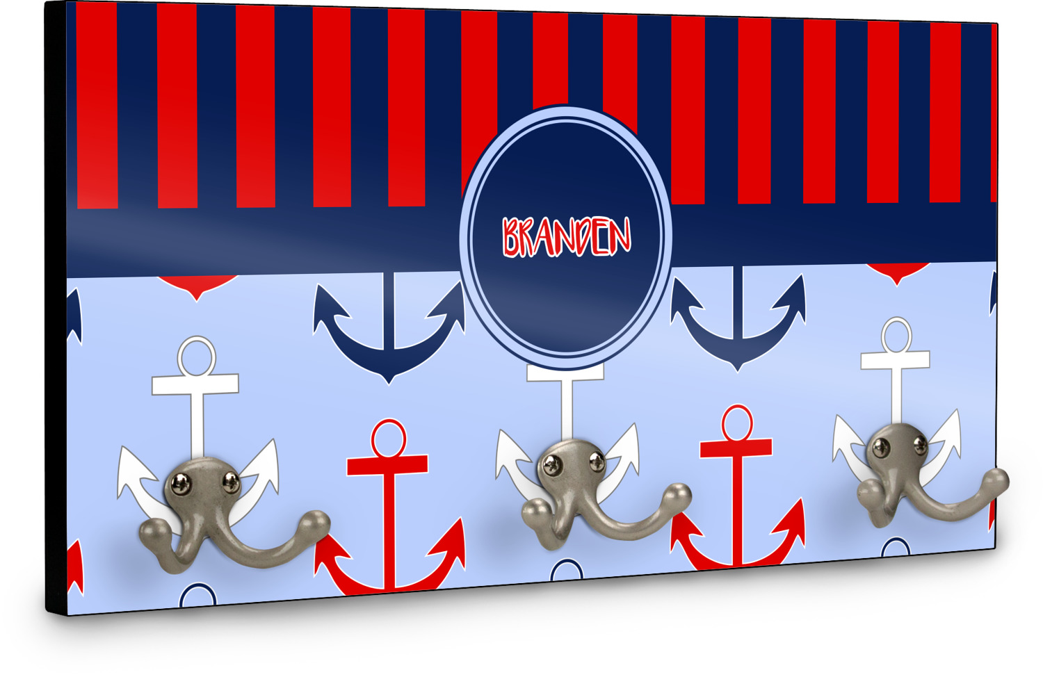 This coat rack is the perfect way to add some personality to your wall or entryway. The board is made of a strong maple that is approximately 16" x 8". The three 2-prong hooks are a sturdy metal that have two screws attaching them to the board. Your design is printed right onto the front of the board while the back and sides are a simple black.