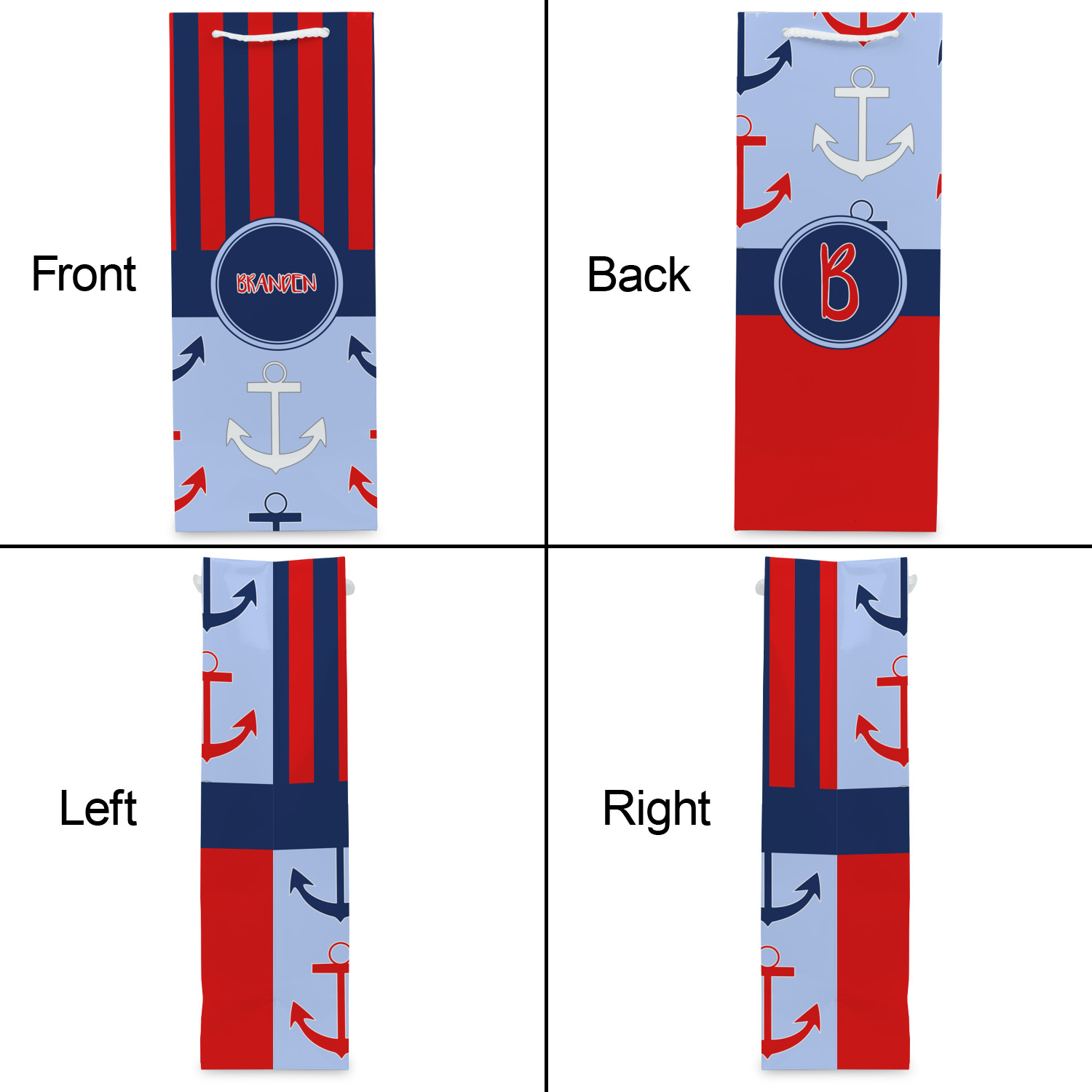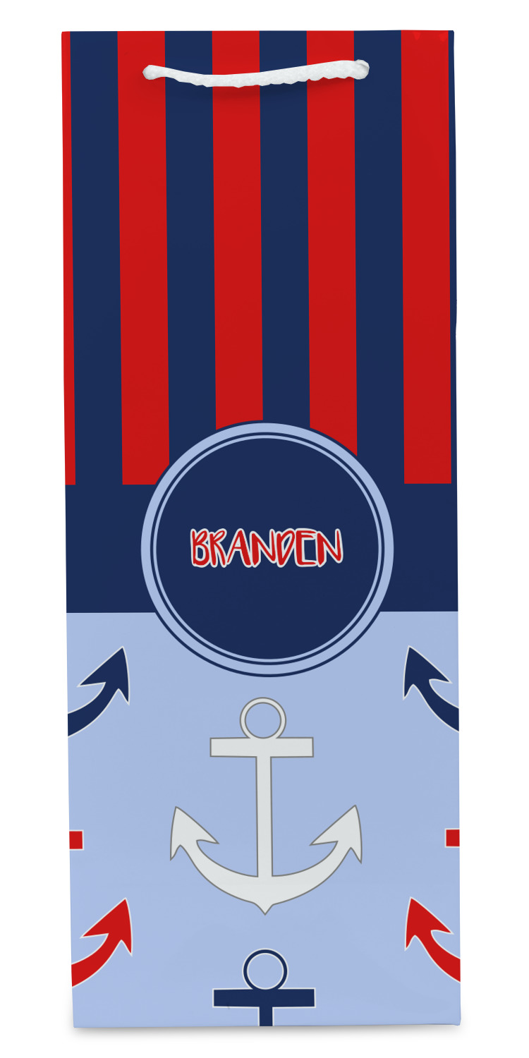 This anchor & stripes pattern is a classic nautical including the colors. We chose the classic nautical red and navy blue striped on top, with anchors in red, white and blue on the bottom. We chose a solid navy ribbon along with a circle label and personalized it with a name.