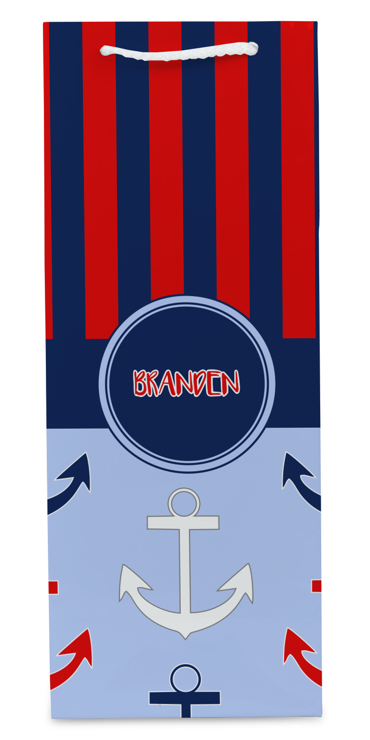This anchor & stripes pattern is a classic nautical including the colors. We chose the classic nautical red and navy blue striped on top, with anchors in red, white and blue on the bottom. We chose a solid navy ribbon along with a circle label and personalized it with a name.