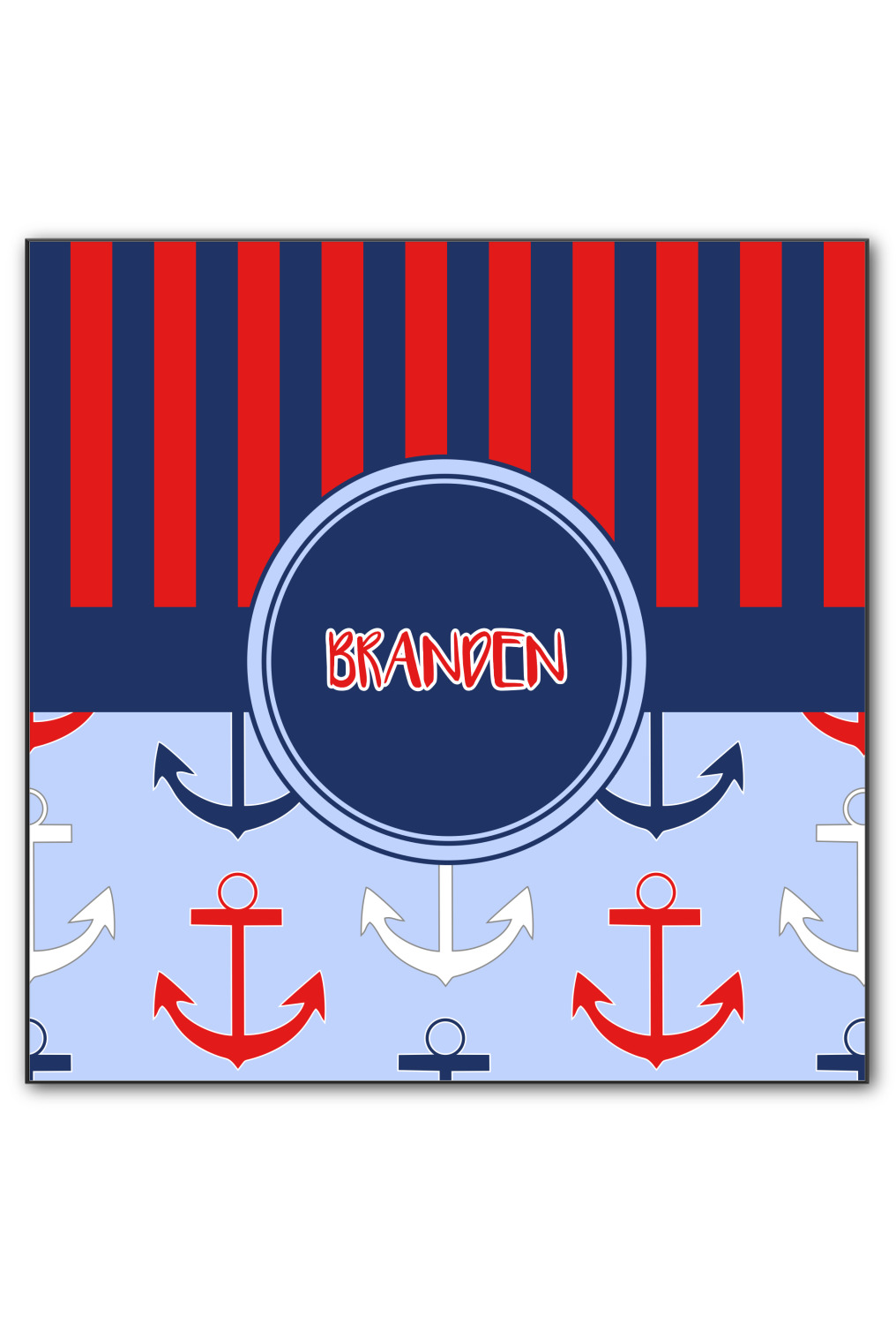 This anchor & stripes pattern is a classic nautical including the colors. We chose the classic nautical red and navy blue striped on top, with anchors in red, white and blue on the bottom. We chose a solid navy ribbon along with a circle label and personalized it with a name.