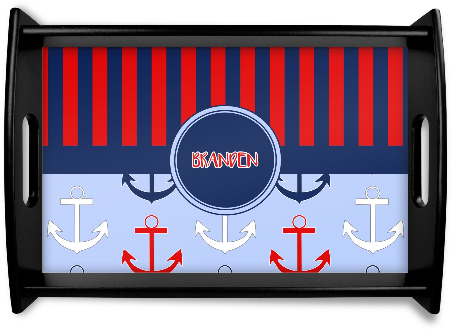 This serving tray with handles features square edges and two rounded sides, creating a very modern look. Each side is fabricated from a beautifully cut, natural wood. The bottom of the interior of the tray displays your customized design in bright, vibrant color. The tray is sold in both a black color and a natural wood look. Each variation of the wood serving tray has two sizes: Small, which is 14" x 10" x 2.25", and Large, which is 19.5" x 13.5" x 2.75".