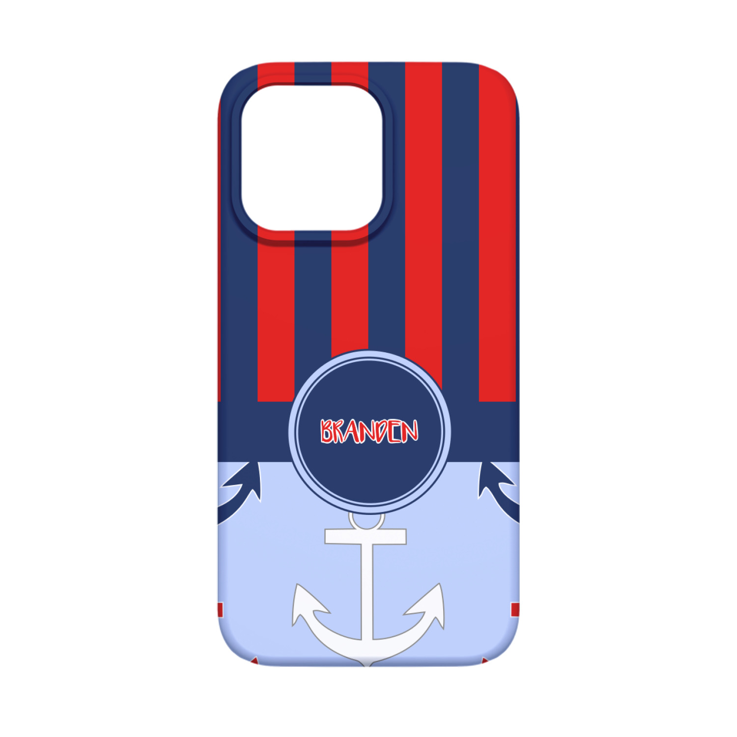 This anchor & stripes pattern is a classic nautical including the colors. We chose the classic nautical red and navy blue striped on top, with anchors in red, white and blue on the bottom. We chose a solid navy ribbon along with a circle label and personalized it with a name.