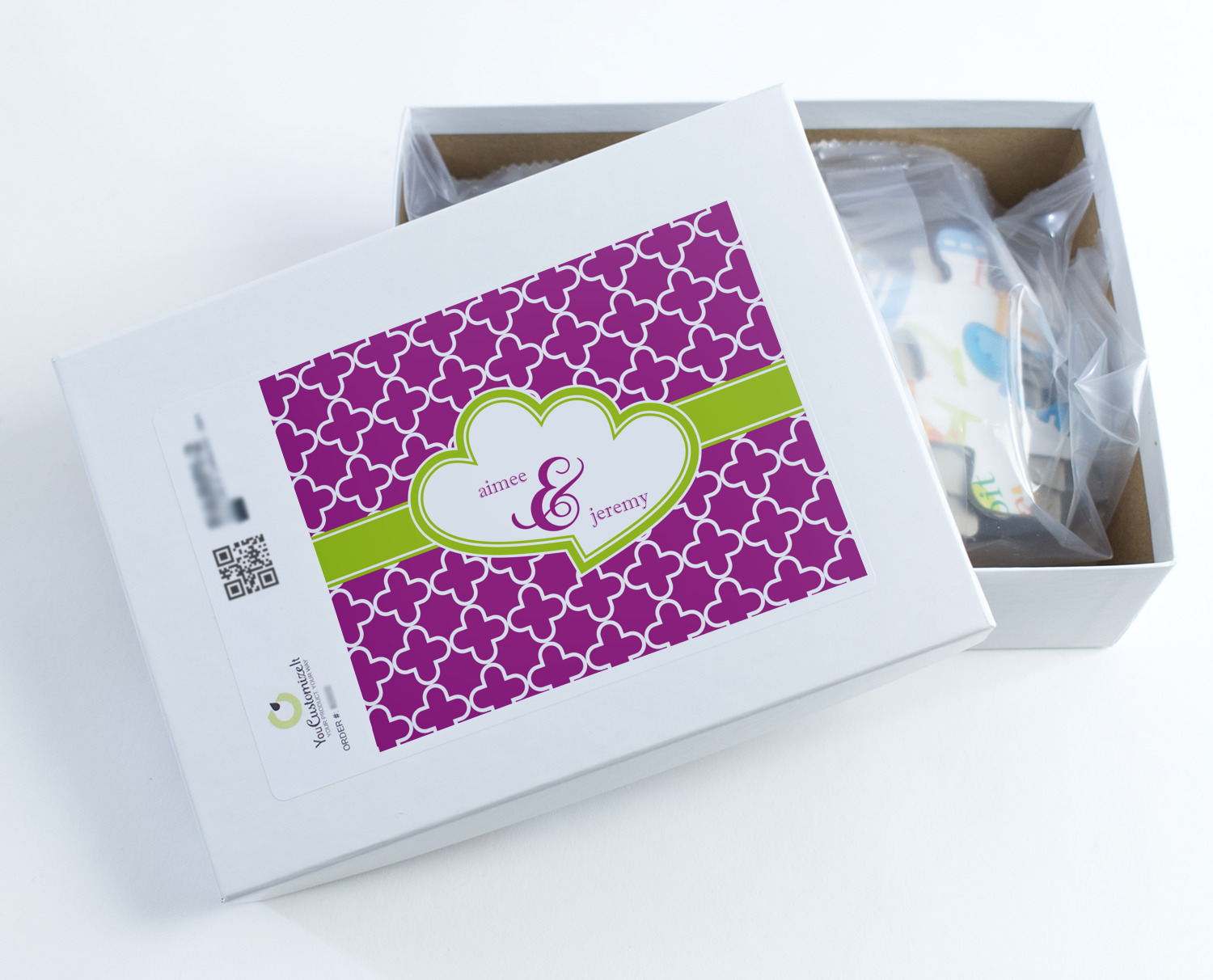 The lime green ribbon provides a sharply contrasting color that draws attention to the double-heart label, the perfect place for his & hers names.