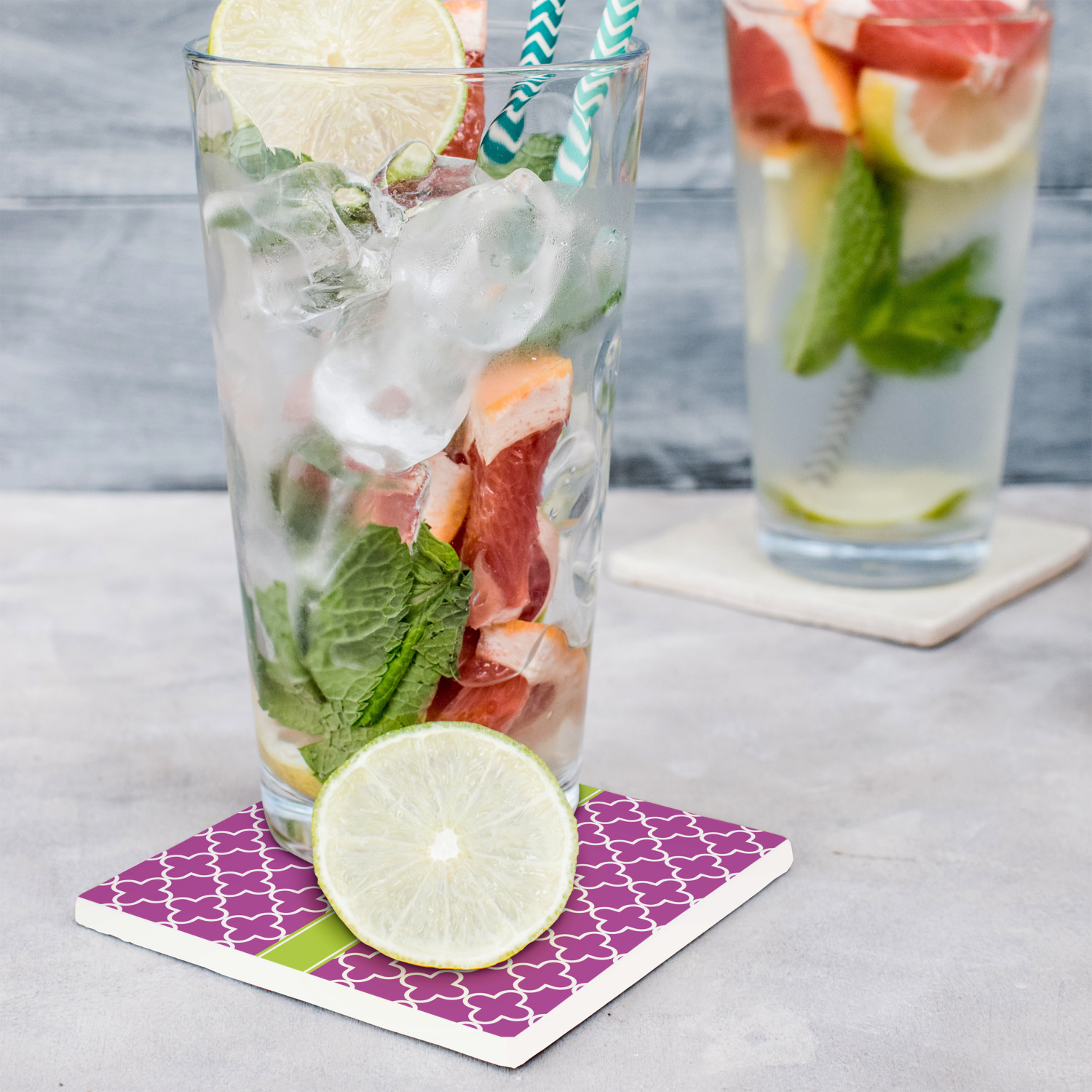 These customized stone coasters are perfect for use with beverages that are served in drinkware that "sweat". When cocktails, sodas, iced tea, water, etc. are served with ice in a regular glasses (non insulated glasses), they release condensation that drips down the outside of the glasses.