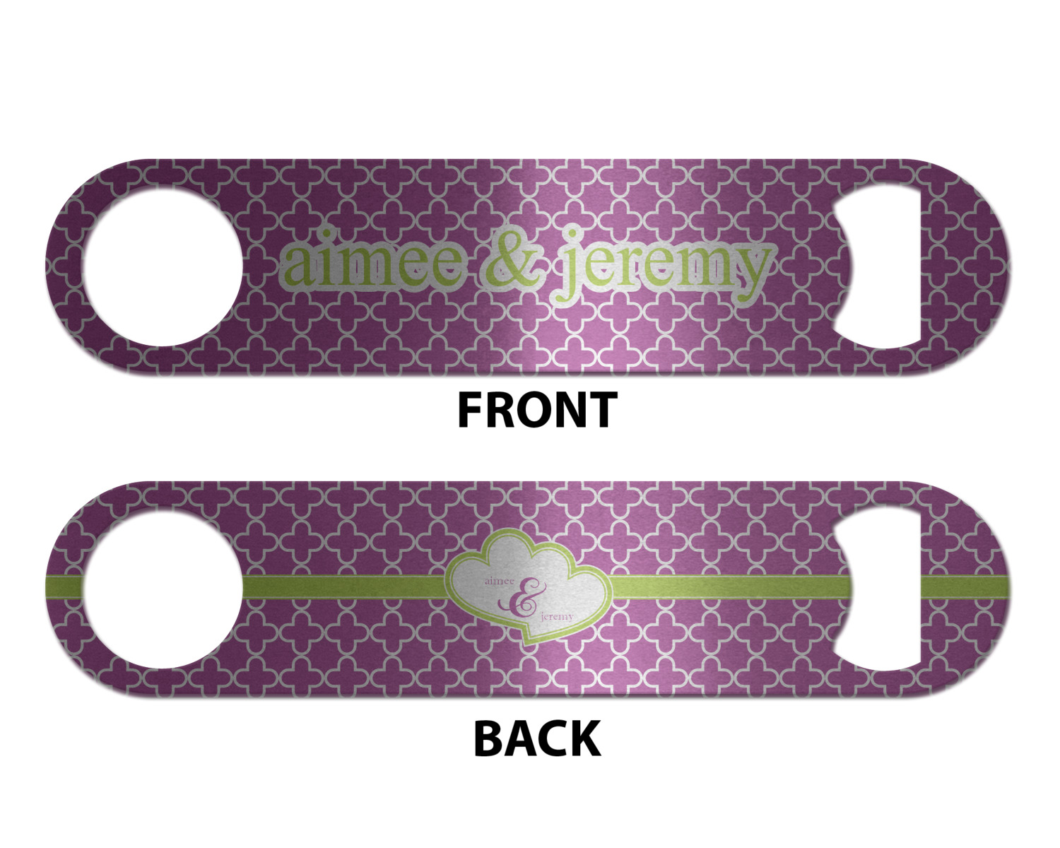 Made from stainless steel, these beer bottle openers are 7 by 1.625 inches, giving you plenty of leverage when trying to open a stubborn bottle. On one end of this personalized bottle opener, you'll find a circular hole for you to hang and display your opener. On the opposite end, you'll find the tool used for opening bottles. This opener in particular has the same structure and style as professional bartender bottle openers. Your customization is sublimated onto both the back and front, and both sides can be customized individually. Choose from one of our two base colors - white or silver.