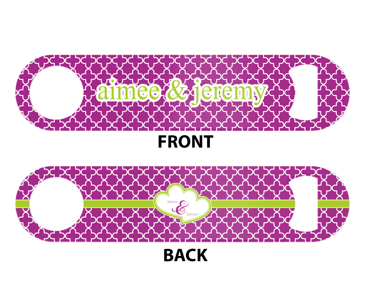 Made from stainless steel, these beer bottle openers are 7 by 1.625 inches, giving you plenty of leverage when trying to open a stubborn bottle. On one end of this personalized bottle opener, you'll find a circular hole for you to hang and display your opener. On the opposite end, you'll find the tool used for opening bottles. This opener in particular has the same structure and style as professional bartender bottle openers. Your customization is sublimated onto both the back and front, and both sides can be customized individually. Choose from one of our two base colors - white or silver.