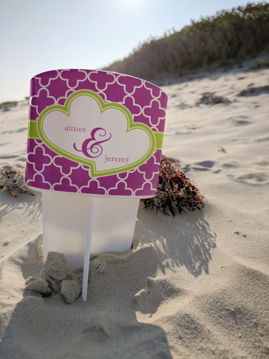 This cup holder has a large stake at its bottom that anchors it to the sand or ground below, while the cup holder rests above the stake. The entire drink holder is made of durable plastic and displays your customization around the cup holder portion. We sell these personalized beach spikers in two different colors: black and white.