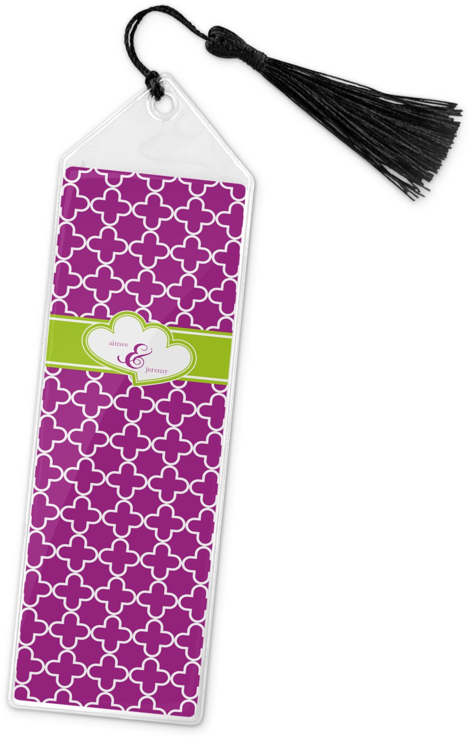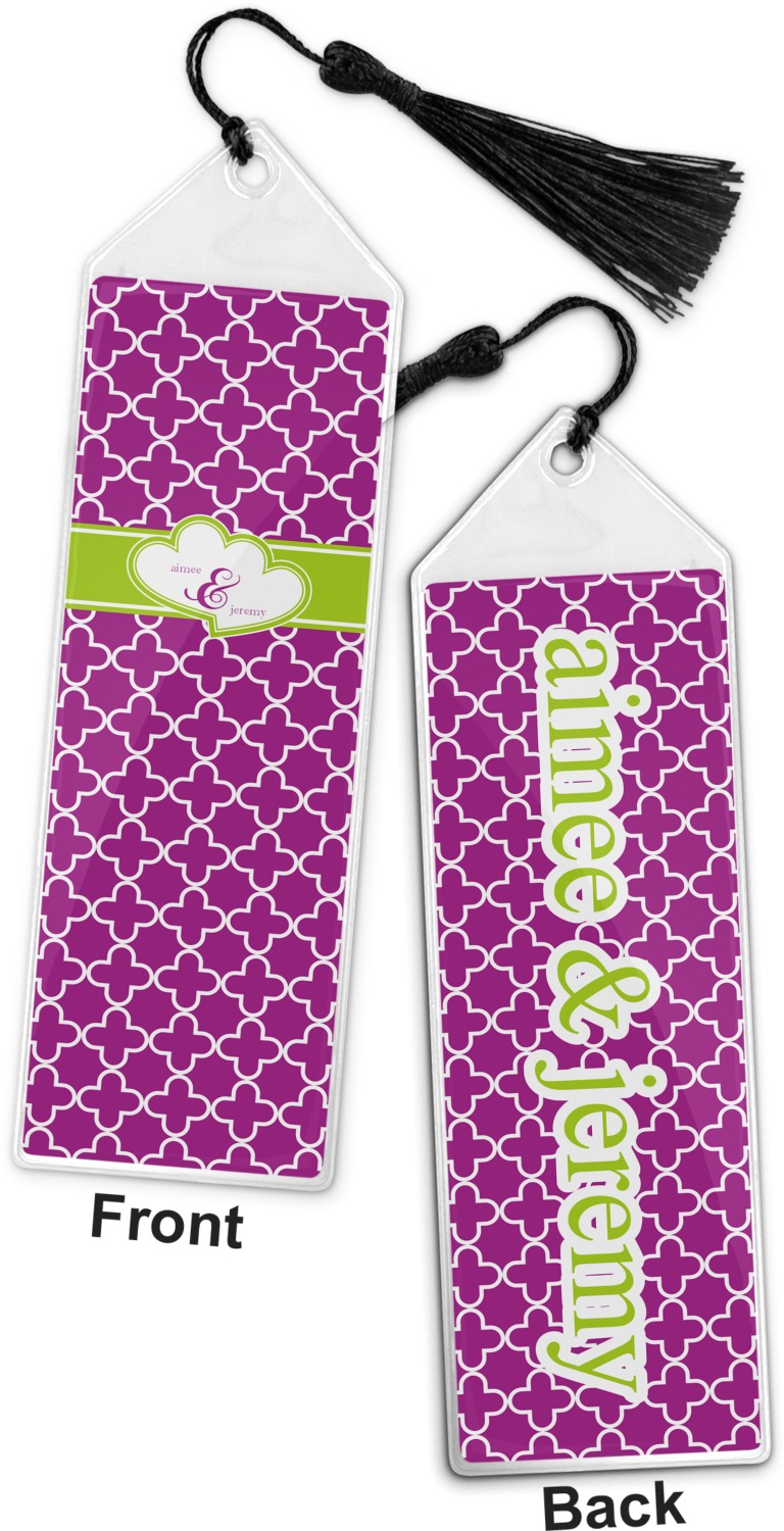 Your personalized bookmark is made of a sturdy, clear vinyl, and is approximately 7.5" x 2.25". We display your personalization on vinyl inserts that are placed on both sides. Accompanying each book marker is a black, fringe tassel that attaches to the reinforced, triangular header.