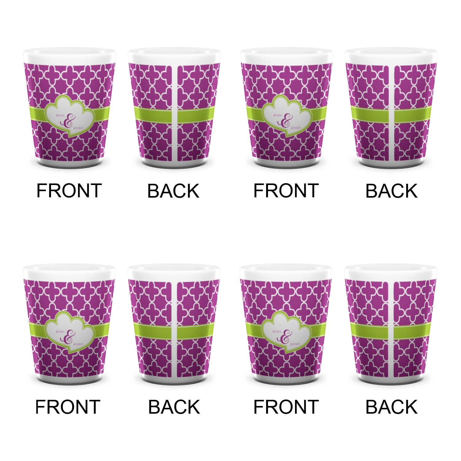 Made from ceramic these shot glasses are printed in full color with the design of your choice. These are a standard 1.5oz size and stand 2.25" tall. Available in a full white ceramic or a two-tone with a black color inside the shot glass. Buy a single or a set of 4, all of which can be designed separately to get you just what you want and need.