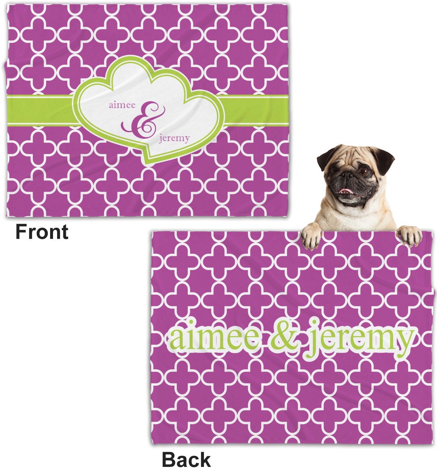 These dog blankets are crafted from a gentle, soft-to-the-touch, minky material. We print your customizations, either matching or differing, on both the top and underside of the blanket. These personalized dog blankets are available in two sizes: regular and large. Our regular size, at 40" x 30", accommodates small and some medium size dogs. At 60" x 50", our large dog blanket is a better fit for bigger breeds. Though specialized for dogs, these blankets still make a thoughtful gift for your favorite feline, or any other pet in mind!