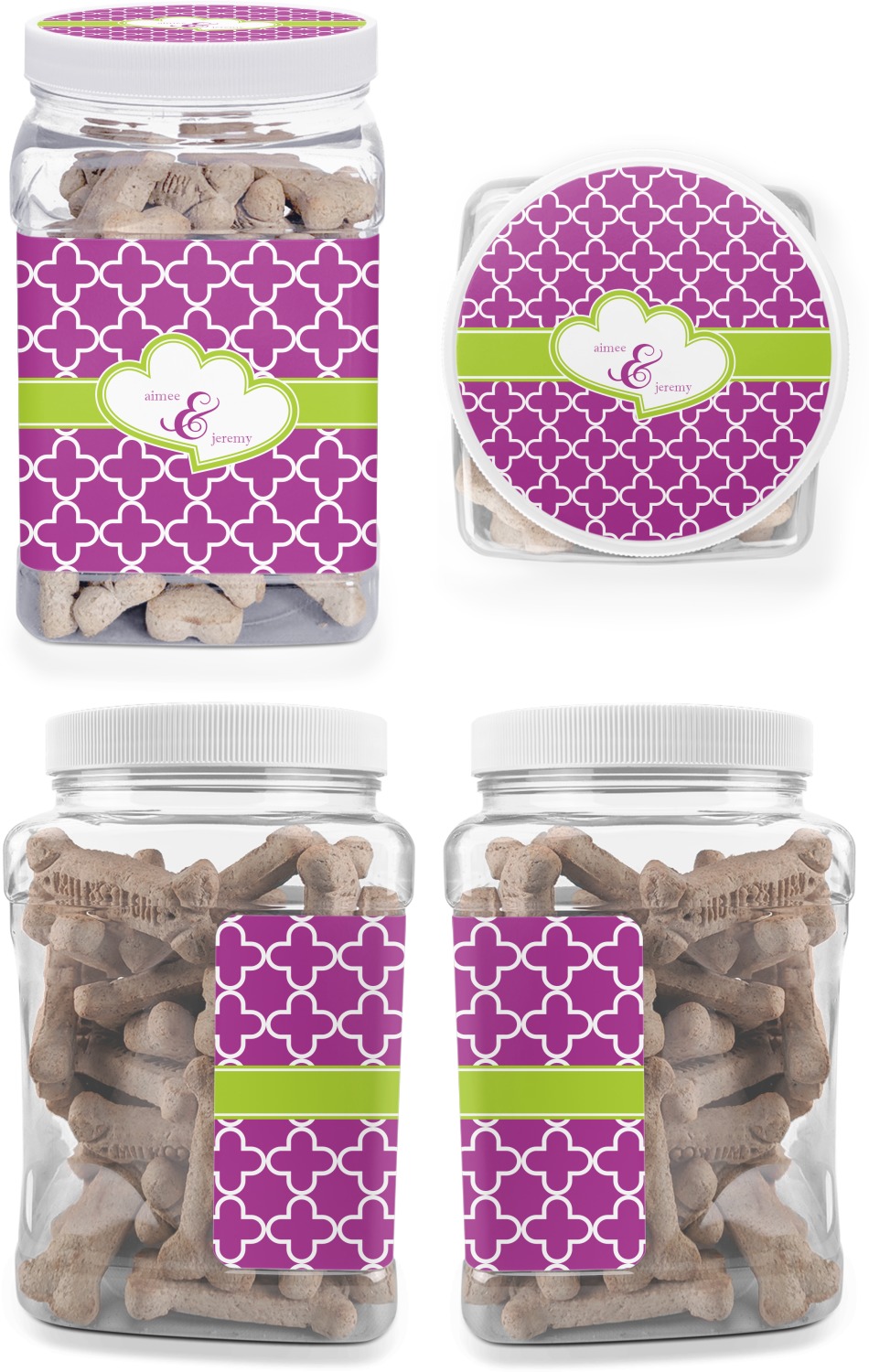 This half gallon jar, made from a sturdy plastic, is the perfect way to keep treats from any naughty pet paws, while still keeping them ready on hand for when your pup performs an impressive trick. This dog cookie jar features a screw-on, white lid that displays your personalized design on a vinyl sticker. We apply another customized sticker that wraps around the front and sides of the jar. Our dog treat jar also has indentations on the rear ends of the sides, which allows for convenient handling, and its square frame allows for easy storage.