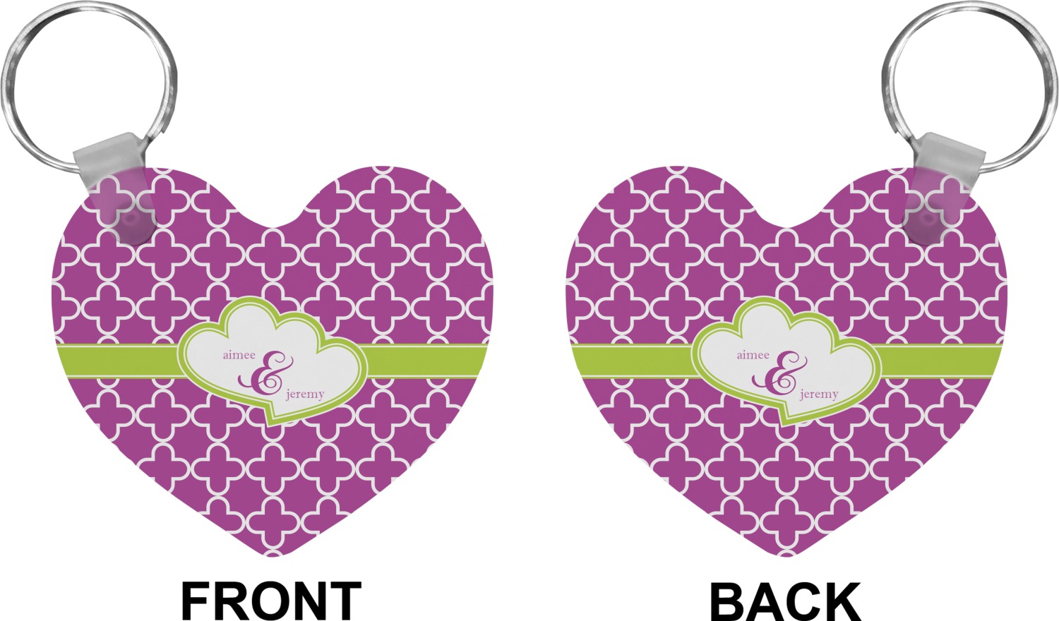 Our personalized keychains attach to the included metal, split key ring with a plastic, removable snap. Since a metal ring is included with your purchase, you have the liberty to keep your keys together on the ring, with or without your unique keychain. We offer this keychain in three different shapes: circle, heart, or diamond. We print your personalized design(s) on both sides of the key chain, and the surface has a glossy, reflective finish that only emphasizes your design. Each keychain is approximately 2.25 by 2.25 inches.