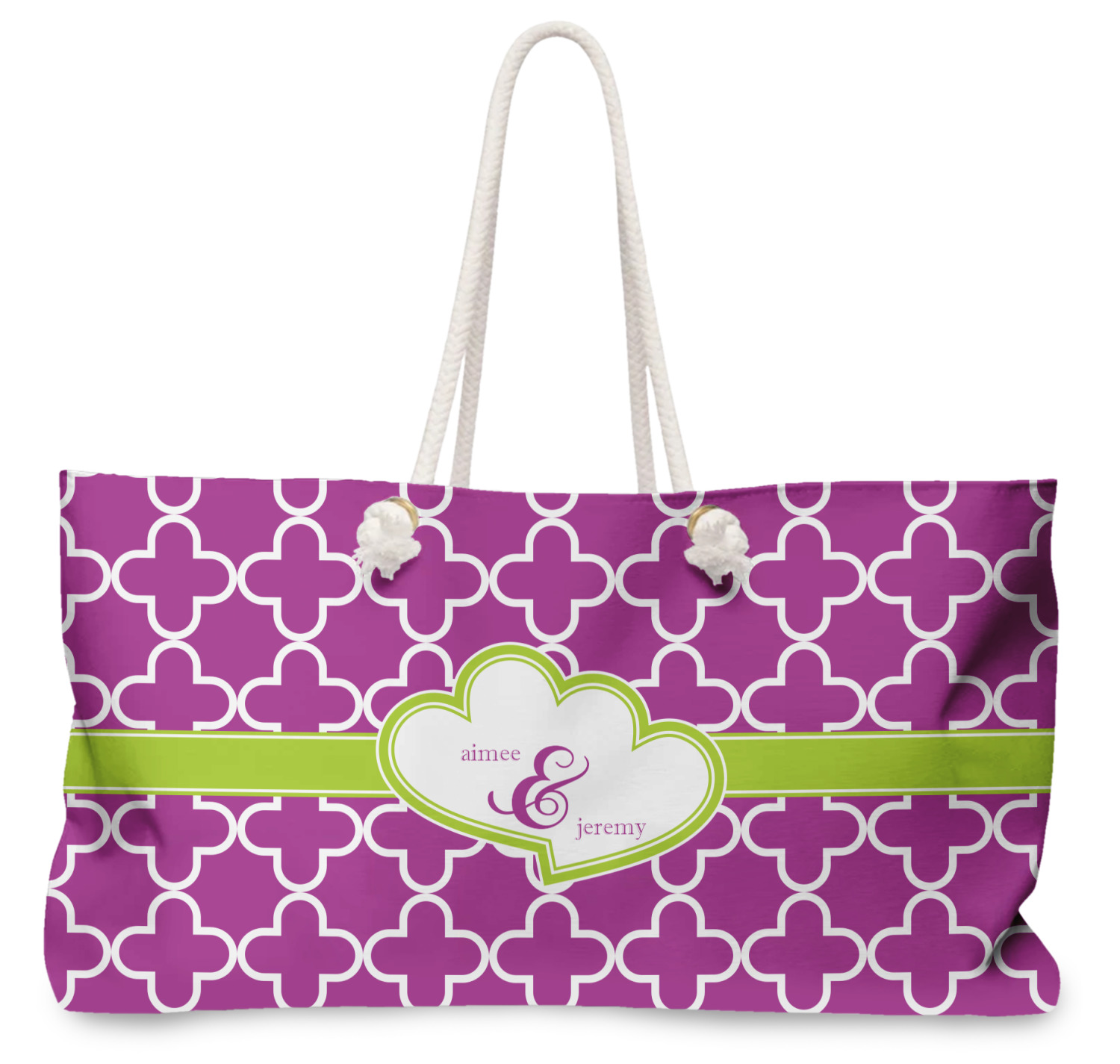 Our oversized weekender tote with rope handles is perfect for your weekend at the beach or on the town. This large tote are 24" W X 13" H, with a 5" gusset and a 27" thick rope handles with a knot that is put through a grommeted brass hole.