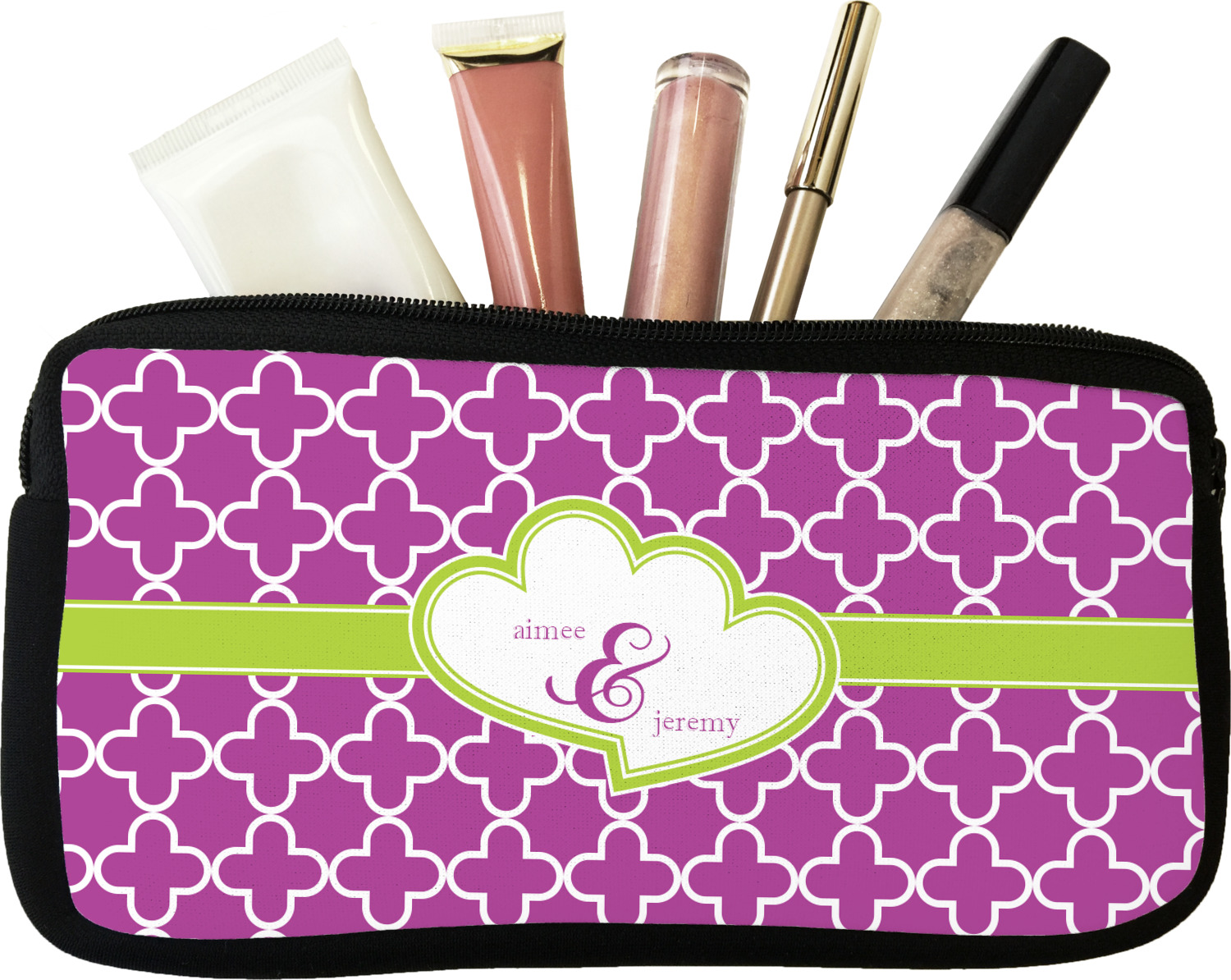Our personalized makeup bags are available in many different designs, patterns and colors - so you are sure to find one that will love. They are made of neoprene (same material as wet-suits) and thus are water resistant, so spillages in your makeup bag will not end up all over you purse. They are customized on one side and are black on the other side and the zipper is black as well.