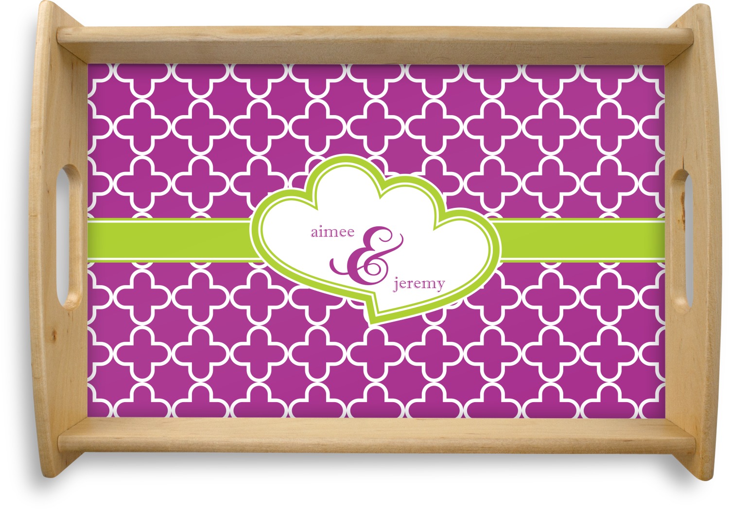 This serving tray with handles features square edges and two rounded sides, creating a very modern look. Each side is fabricated from a beautifully cut, natural wood. The bottom of the interior of the tray displays your customized design in bright, vibrant color. The tray is sold in both a black color and a natural wood look. Each variation of the wood serving tray has two sizes: Small, which is 14" x 10" x 2.25", and Large, which is 19.5" x 13.5" x 2.75".