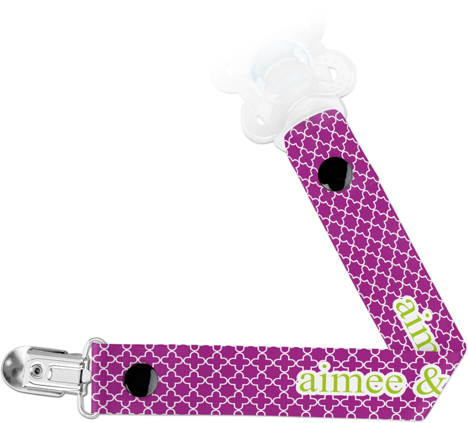 This personalized pacifier clip is the ideal size and measures at approximately 7.5 inches in length, when either end is snapped closed. On one end, you'll find a snap button. This button of your baby's pacifier holder is what can be attached to their pacifier to hold is securely in place. Simply open the snap, slip it through the pacifier opening, and snap it back into place. On the opposite end of this baby pacifier holder, you'll find a metal clip that can secure to a baby's collar or sleeve. This clip ensures that the strap stays in place, and that your baby's pacifier is always on hand.