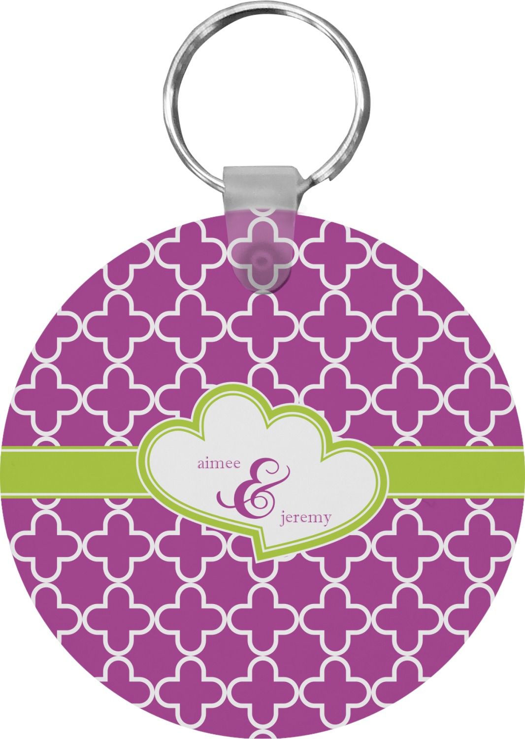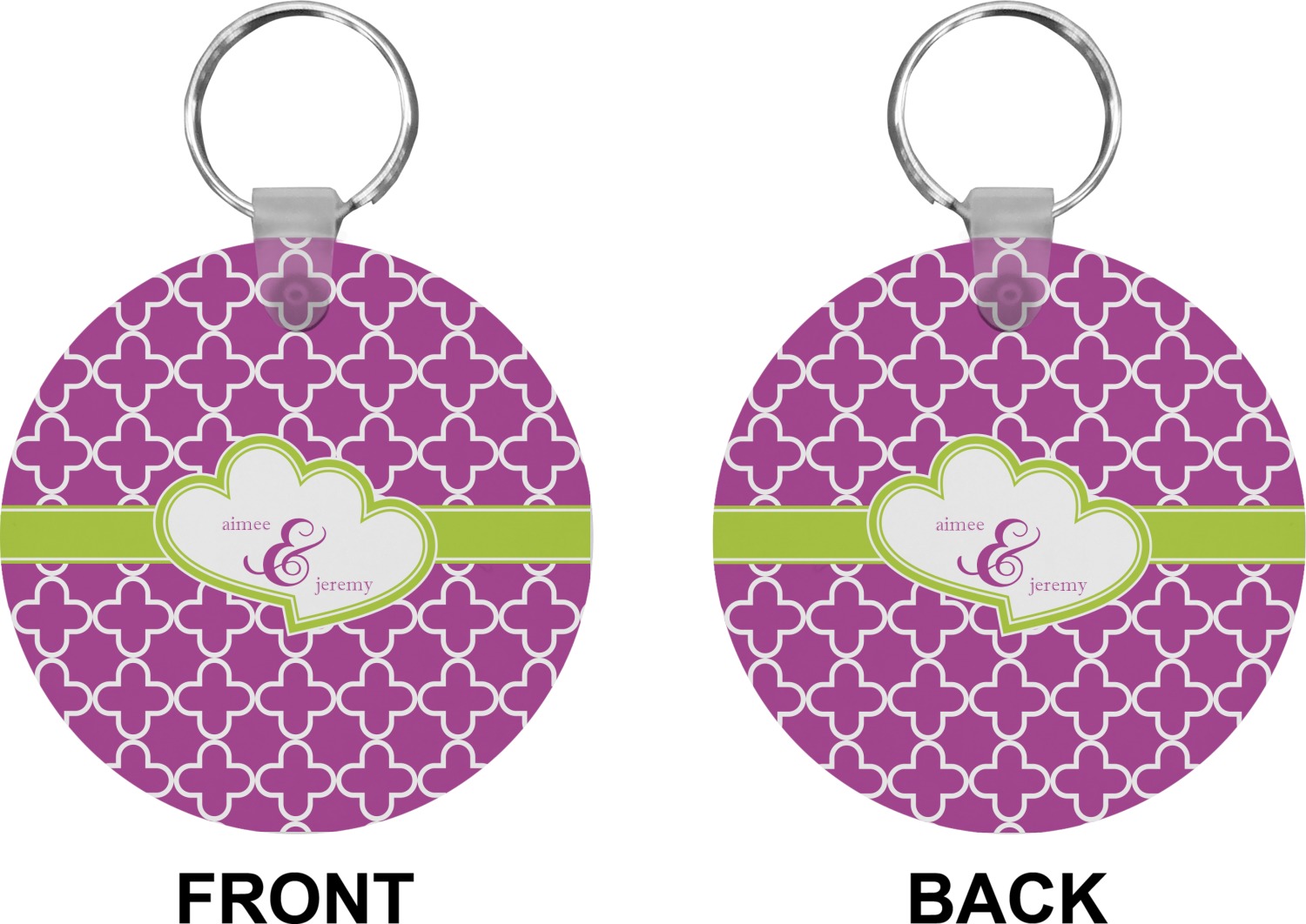 Our personalized keychains attach to the included metal, split key ring with a plastic, removable snap. Since a metal ring is included with your purchase, you have the liberty to keep your keys together on the ring, with or without your unique keychain. We offer this keychain in three different shapes: circle, heart, or diamond. We print your personalized design(s) on both sides of the key chain, and the surface has a glossy, reflective finish that only emphasizes your design. Each keychain is approximately 2.25 by 2.25 inches.