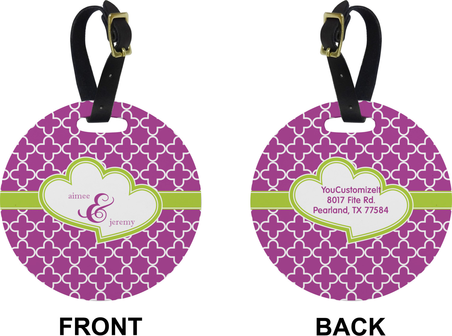 These cute luggage tags are made of a fiber-reinforced, UV-resistant plastic, making them waterproof and durable enough for both everyday use and the rugged adventures of any traveler! A leather strap with holes and a buckle is included with your purchase and can be used to attach your custom luggage tag to any suitcase, backpack, or duffel bag. You can design these travel tags as you wish; your customization will be displayed across the front, while the back will show as little or as much personal information as you want.