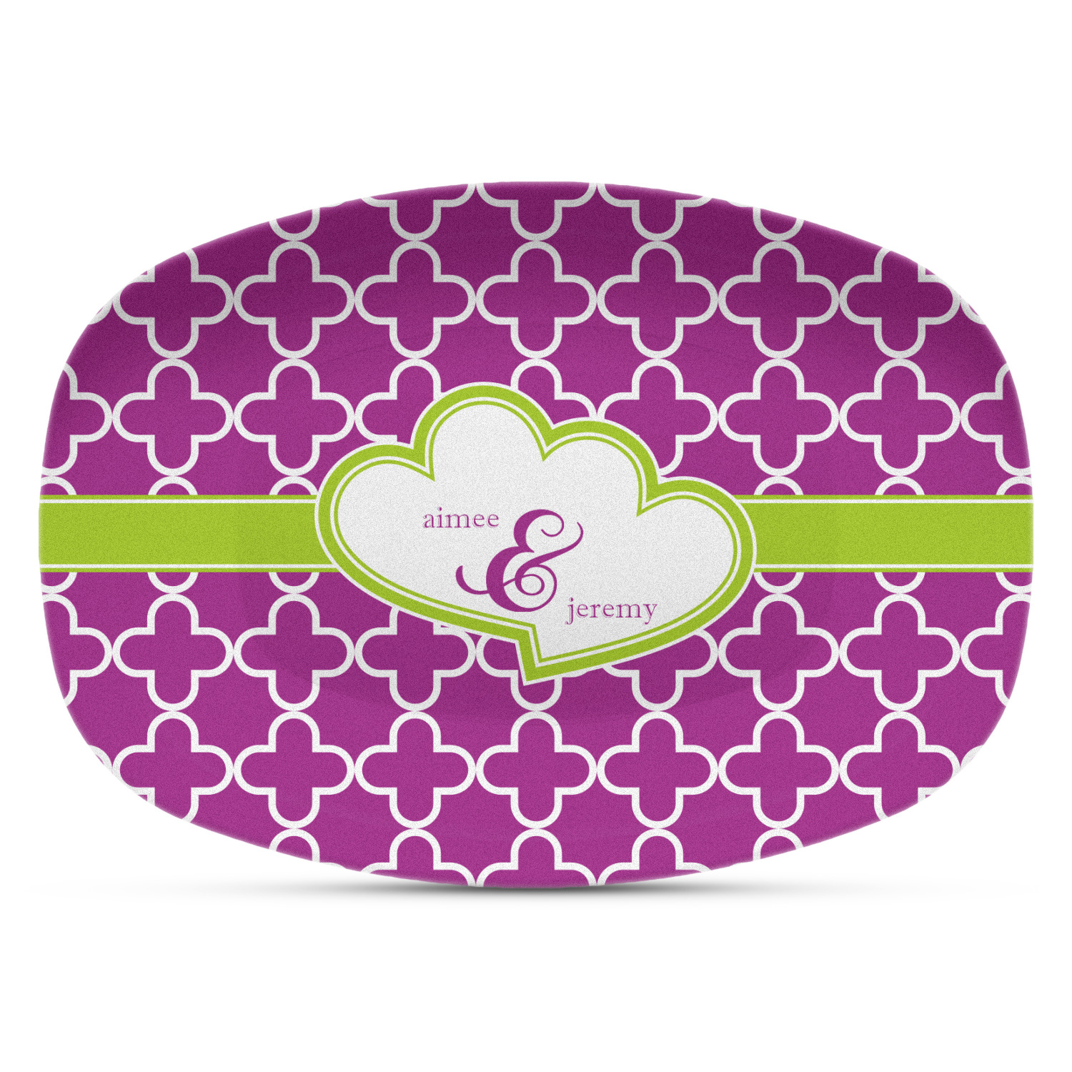 These serving platters are made from a composite, thermo-set, polymer plastic that gives it the versatility, durability, and weight of a melamine platter, without any of the downsides of melamine. These personalized platters, can withstand temperatures up to 250 degrees Fahrenheit, for up to 60 minutes. No harmful chemicals, such as BPA, formaldehyde, and DEHPs were used in the manufacturing of this product. This large serving platter measures at 14" x 10.25", and is spacious enough to hold any of your appetizers or bite-sized desserts. The platter exhibits your personalization across the entirety of its front.