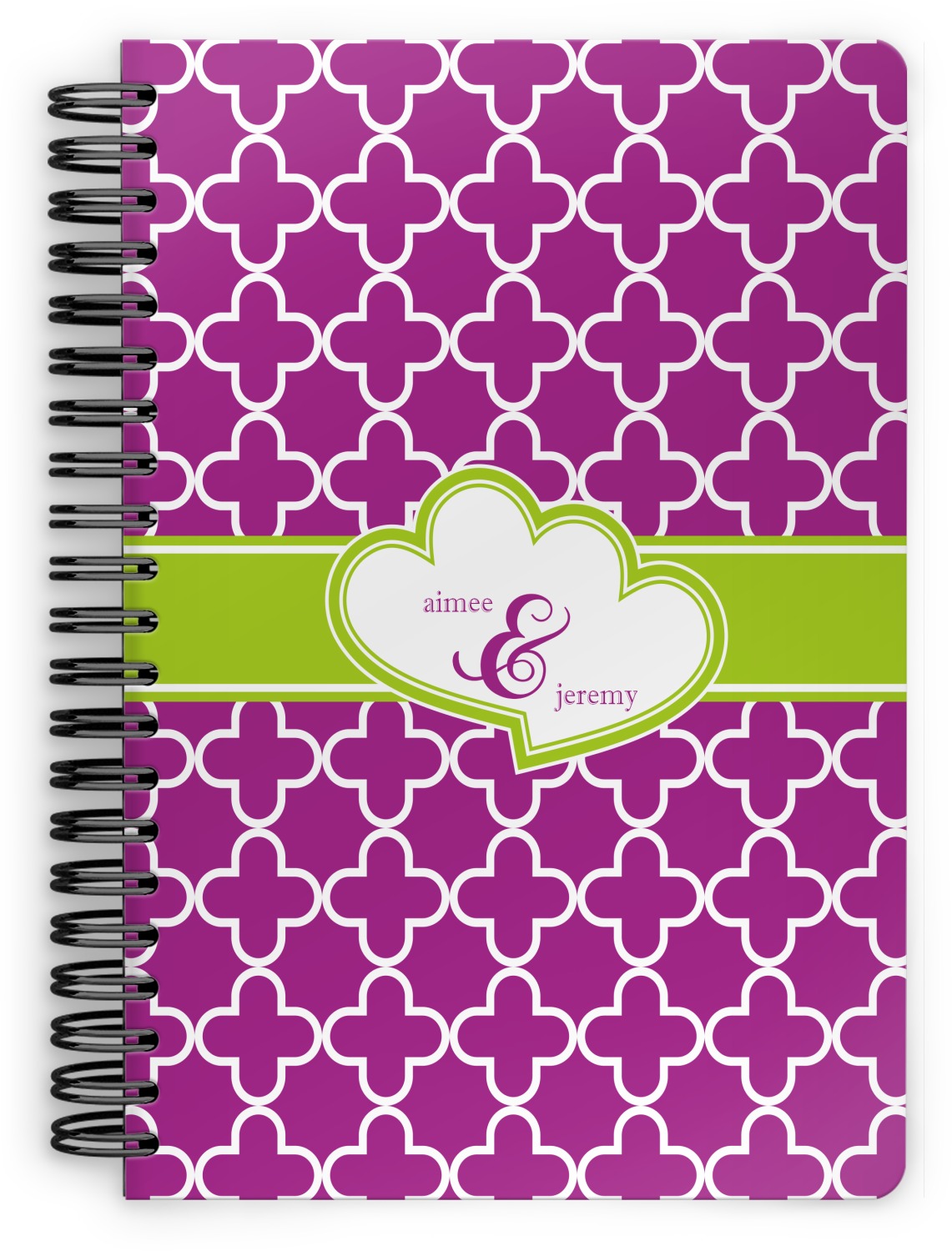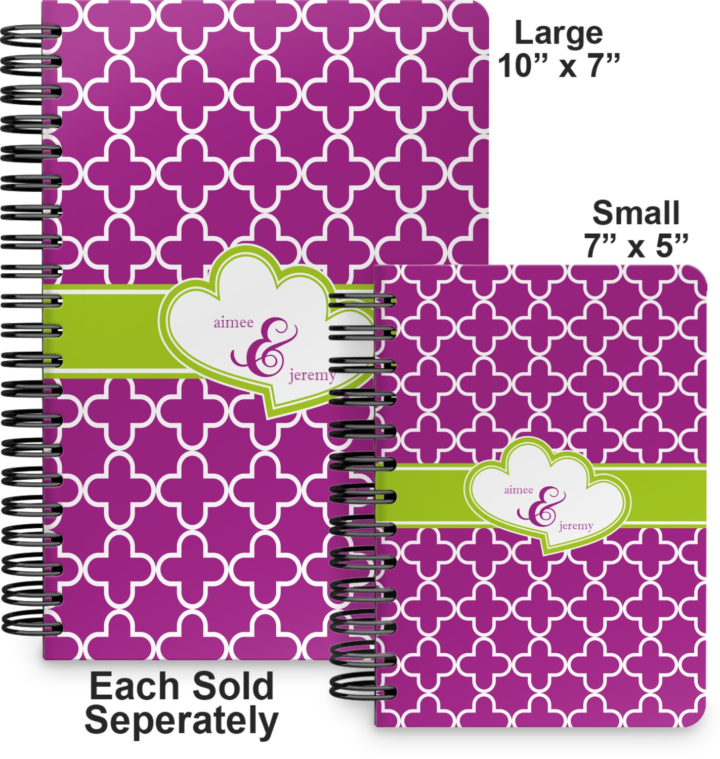 This spiral notebook includes 75 sheets of thick, ruled paper. The front and back of this custom notebook is made of a robust, laminate, plastic covering. We print your personalization on these two panels, underneath a glossy finish, which emphasizes the colors of your design. The two panels and the sheets of paper are held together by a sturdy, black coil. The paper within your bound notebook is perforated for easy, clean tearing.