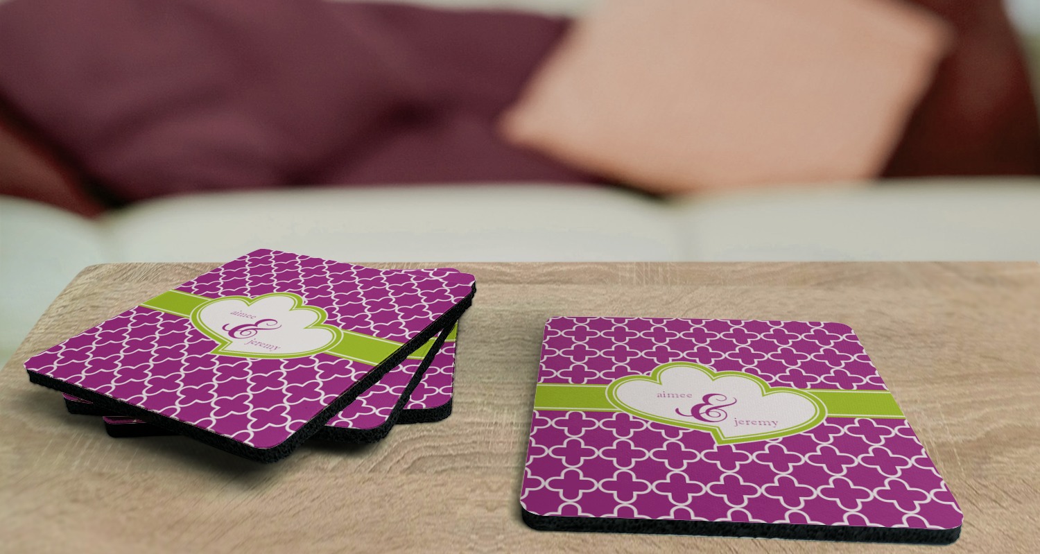 Replace your boring, run-of-the-mill coasters with a set of 4 personalized coasters! When personalized, these coasters will protect your beloved surfaces while adding to your home's decor! Thanks to your coasters bright colors and unique design, your guests will be eager to use them!