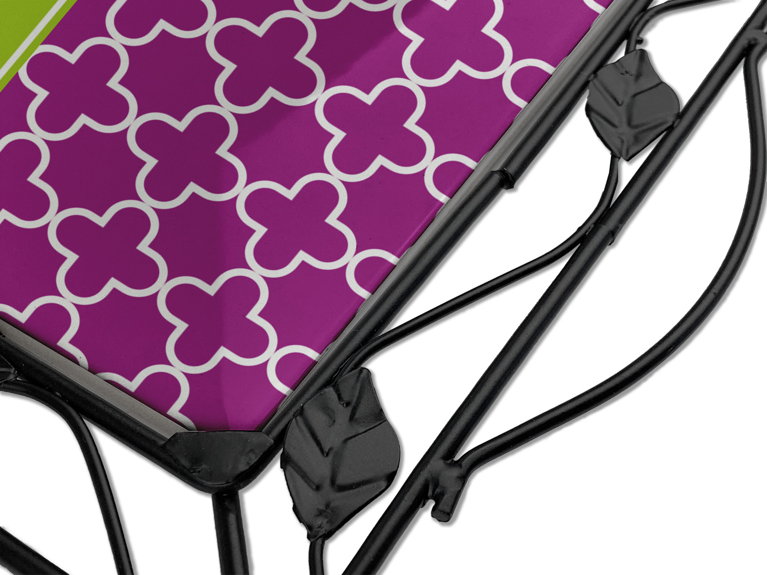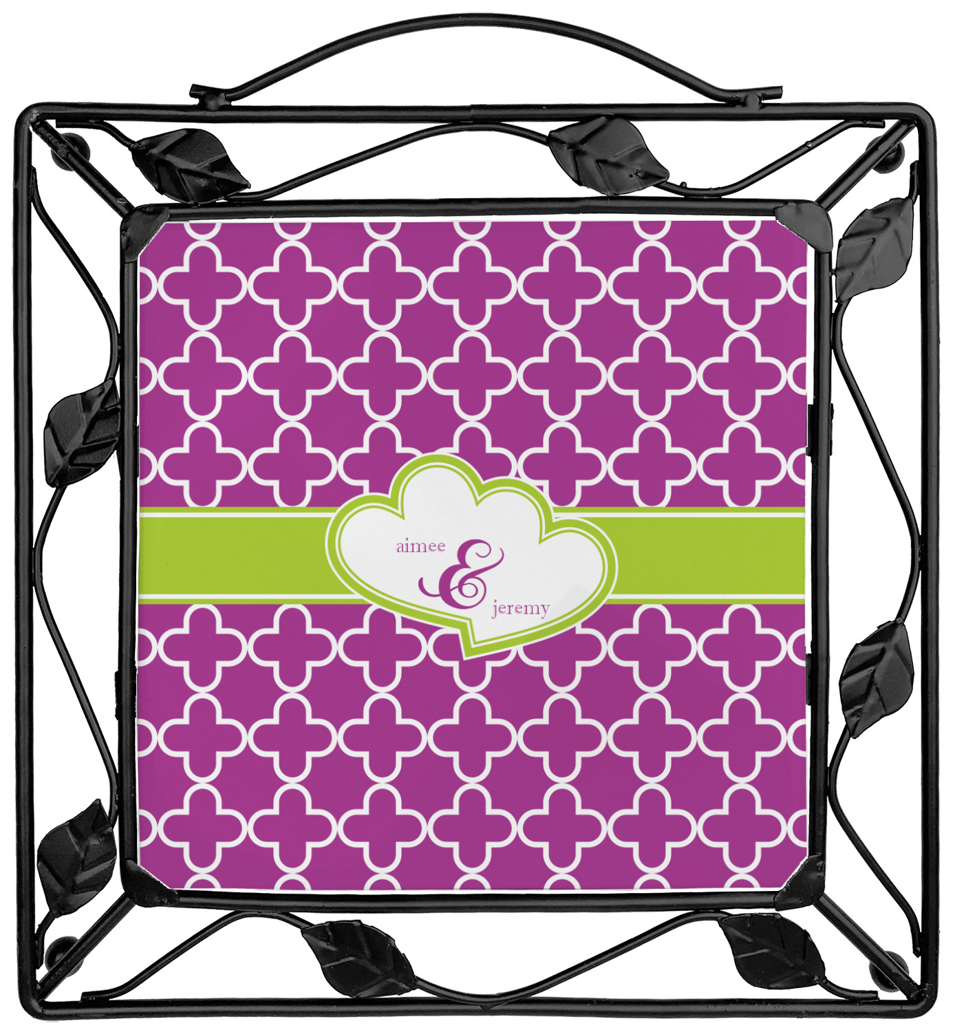 Our square trivets are made from a durable, wrought iron. This model features 4 small half circles, one on each corner, and a larger ring of iron that circles the central, customized tile. Each of the 4 corners has a round foot on its bottom for stability. This trivet is 8.75 by 8.75 inches, but the central tile measures at 6 inches on both sides.