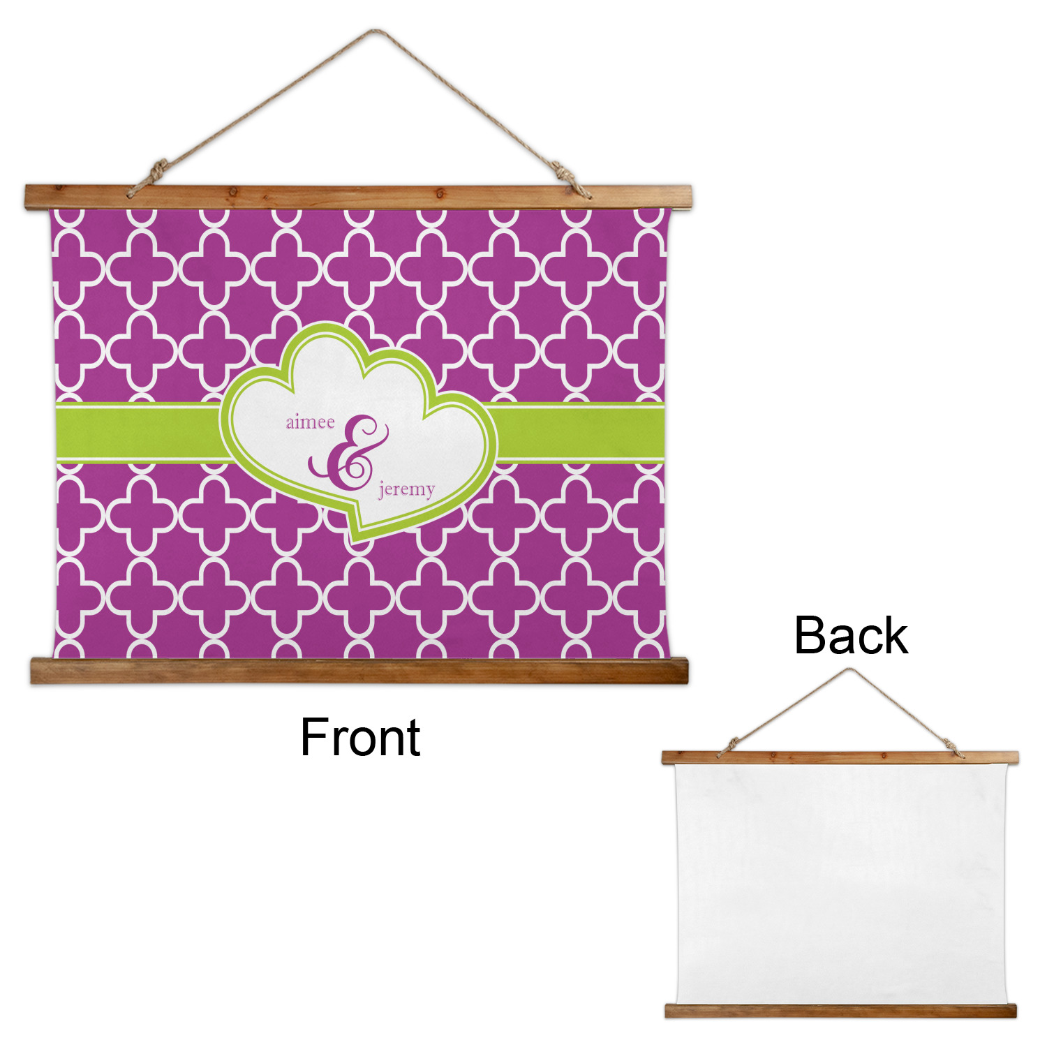 Made in two different orientations - portrait or landscape - both are 26" x 36". Your design is printed on a high quality polyester fabric with hemmed edges. The wood on the top and bottom of the tapestry is 1.25" tall and 0.25" thick and there are two pieces on top and bottom which sandwich the fabric.