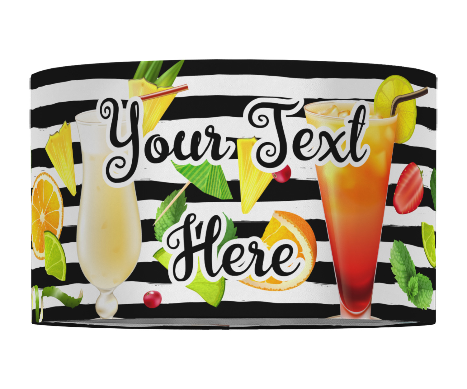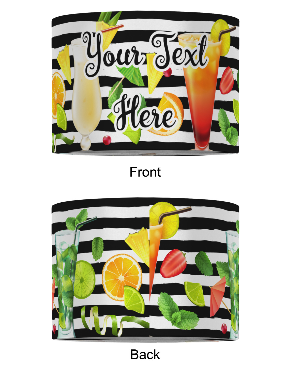 This design has gorgeous illustrations of several different kinds of mixed drinks from mojitos to margaritas. They're are a variety of colors like pink, orange, green, yellow, black, and white. Behind the cocktails is a fun striped pattern giving it a bit of pizazz. You are able to personalize the text with a name, monogram, or whatever you like.