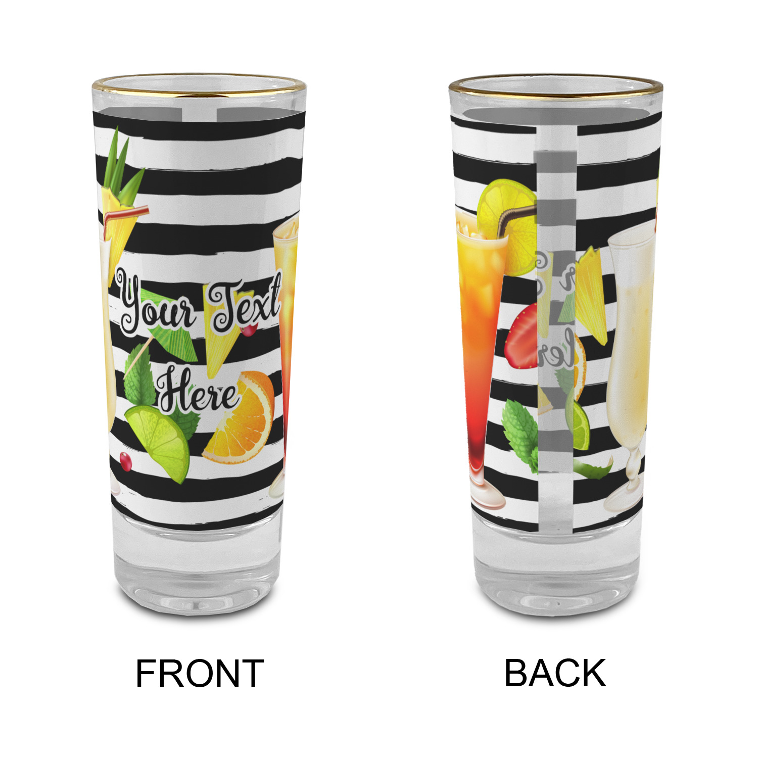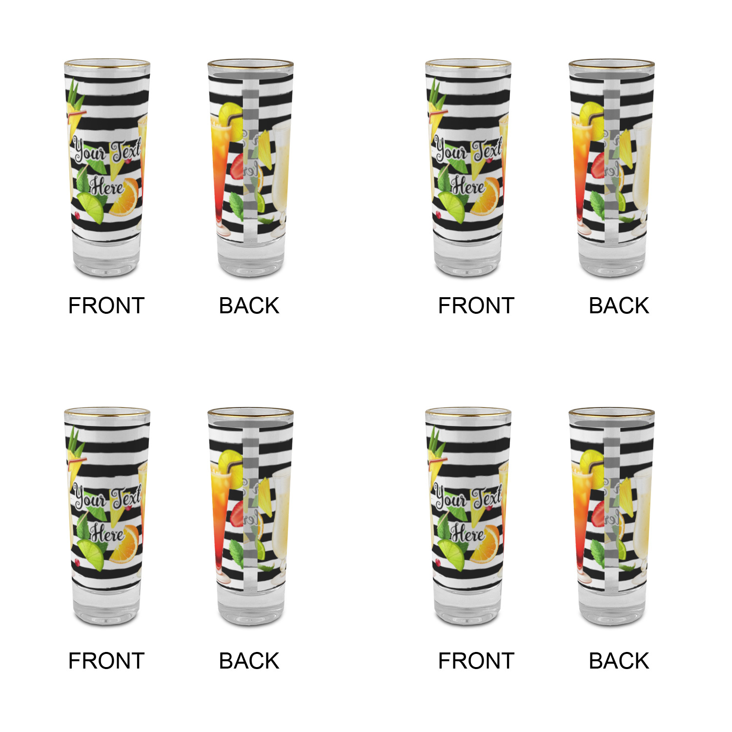 These glass shooter glasses are printed in full color with the design of your choice. These are a tall shooter 2 oz size and stand 4" tall. The print is a full wrap design to boldly display your personalization.