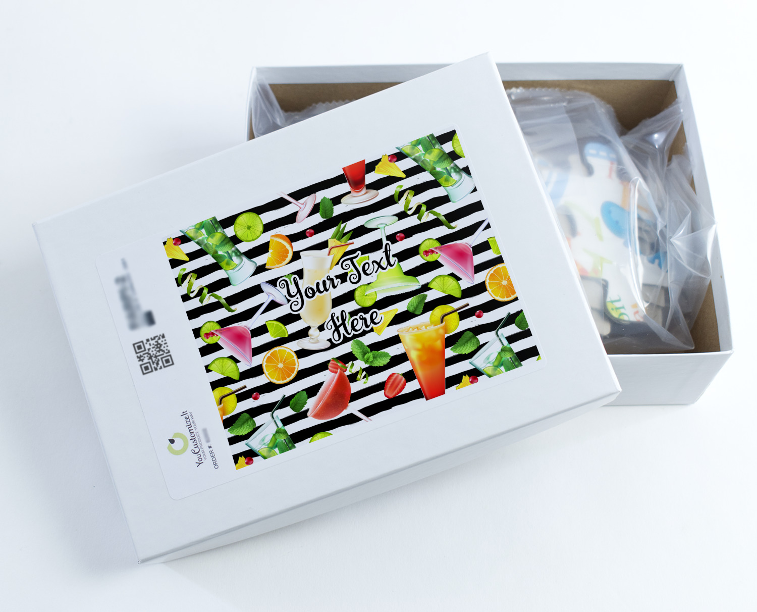 This design has gorgeous illustrations of several different kinds of mixed drinks from mojitos to margaritas. They're are a variety of colors like pink, orange, green, yellow, black, and white. Behind the cocktails is a fun striped pattern giving it a bit of pizazz. You are able to personalize the text with a name, monogram, or whatever you like.