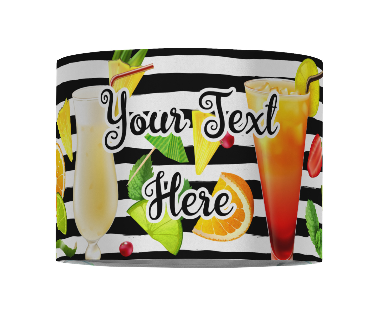 This design has gorgeous illustrations of several different kinds of mixed drinks from mojitos to margaritas. They're are a variety of colors like pink, orange, green, yellow, black, and white. Behind the cocktails is a fun striped pattern giving it a bit of pizazz. You are able to personalize the text with a name, monogram, or whatever you like.