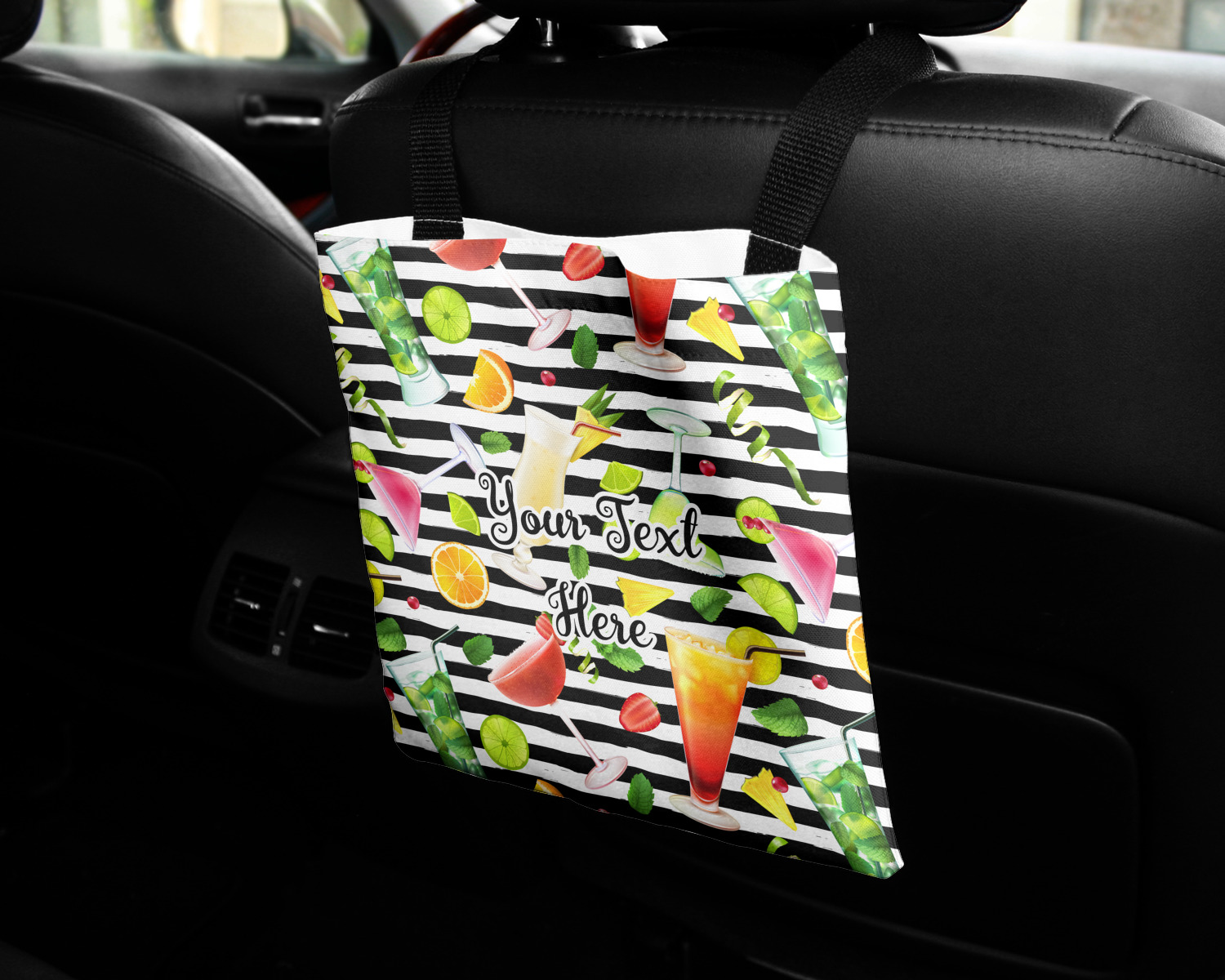 These car back seat organizers are sturdy tote-like bags, fabricated from a robust polyester, and features a single handle on the back side. The strap features an attachable velcro for easy attachment to headrests, grocery carts, car seats, and more. Simply undo the velcro, loop the strap around the headrest, reattach the velcro, and let the organizer hang from the front seat. These car organizers are the perfect means of increasing your backseat's legroom, while storing multiple items in one place for better accessibility. Each car back seat organizer measures at 10 by 10 inches, and features your personalized design printed across its front and back.