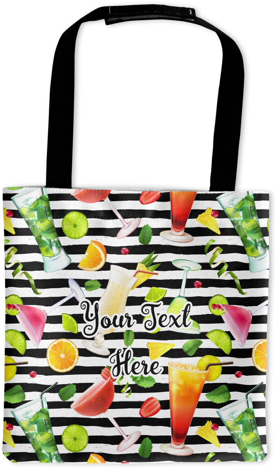This design has gorgeous illustrations of several different kinds of mixed drinks from mojitos to margaritas. They're are a variety of colors like pink, orange, green, yellow, black, and white. Behind the cocktails is a fun striped pattern giving it a bit of pizazz. You are able to personalize the text with a name, monogram, or whatever you like.
