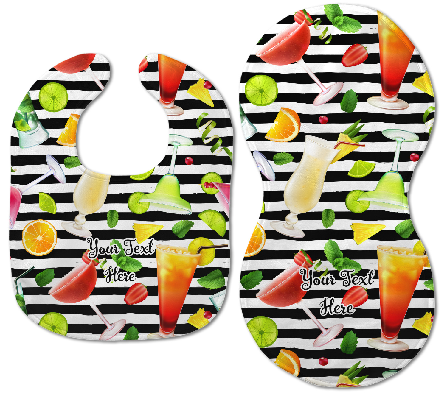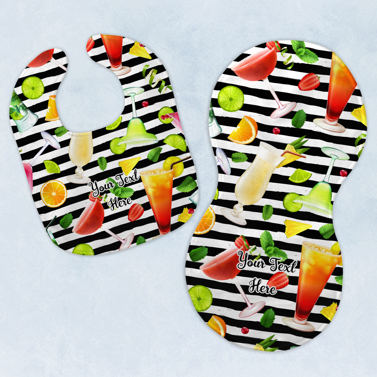 Both our baby bib and burp pad are made up of soft, microfiber velour with a cotton backing. The comfortable and plush material of our bib and burp set is perfect for both baby and parent. We print your design on the microfiber velour face fabric with baby safe ink on your customizable bib and burp cloth to ensure safety for the little one! Our drool bib also comes with a Velcro clasp for safe and easy wear while the burp cloth is a unique peanut shape that perfectly hugs over the shoulder.
