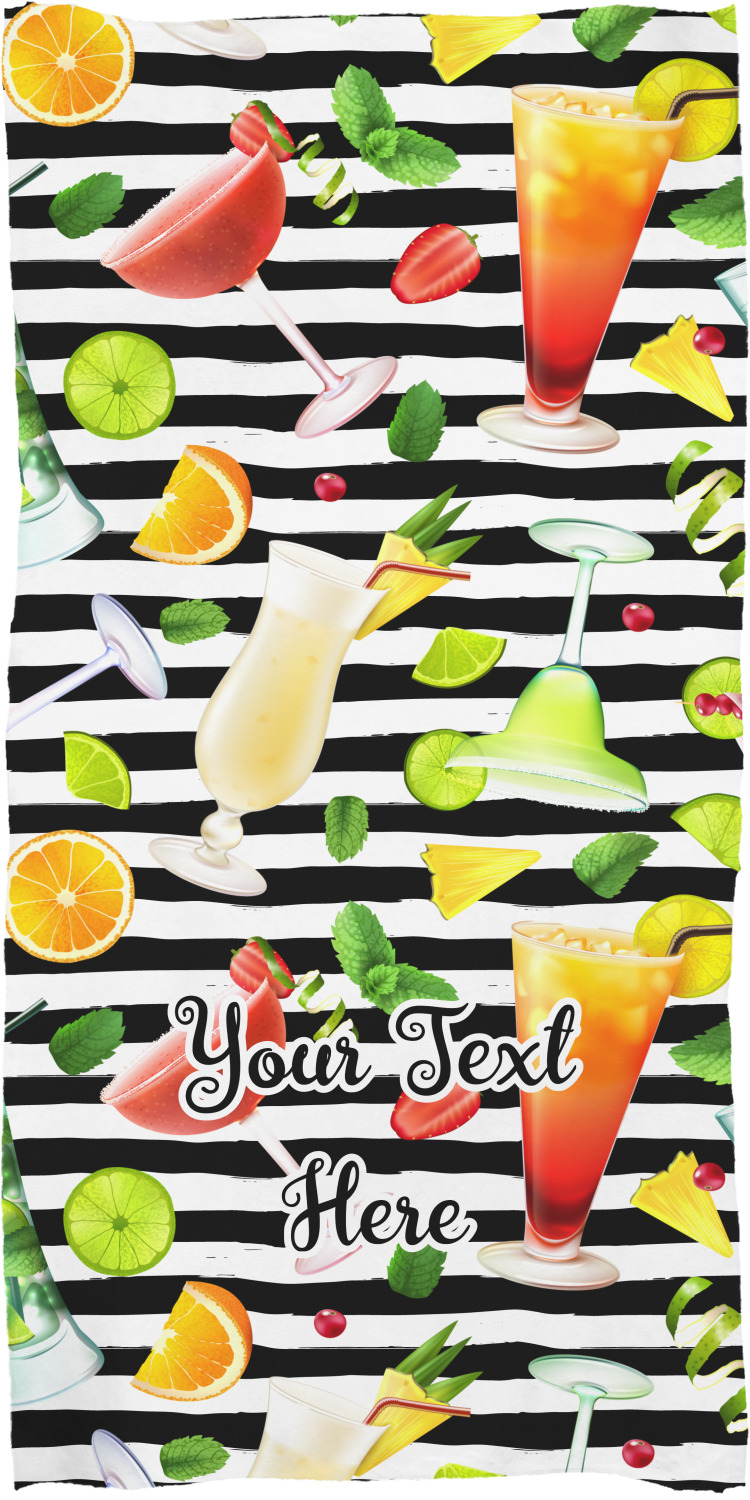This design has gorgeous illustrations of several different kinds of mixed drinks from mojitos to margaritas. They're are a variety of colors like pink, orange, green, yellow, black, and white. Behind the cocktails is a fun striped pattern giving it a bit of pizazz. You are able to personalize the text with a name, monogram, or whatever you like.