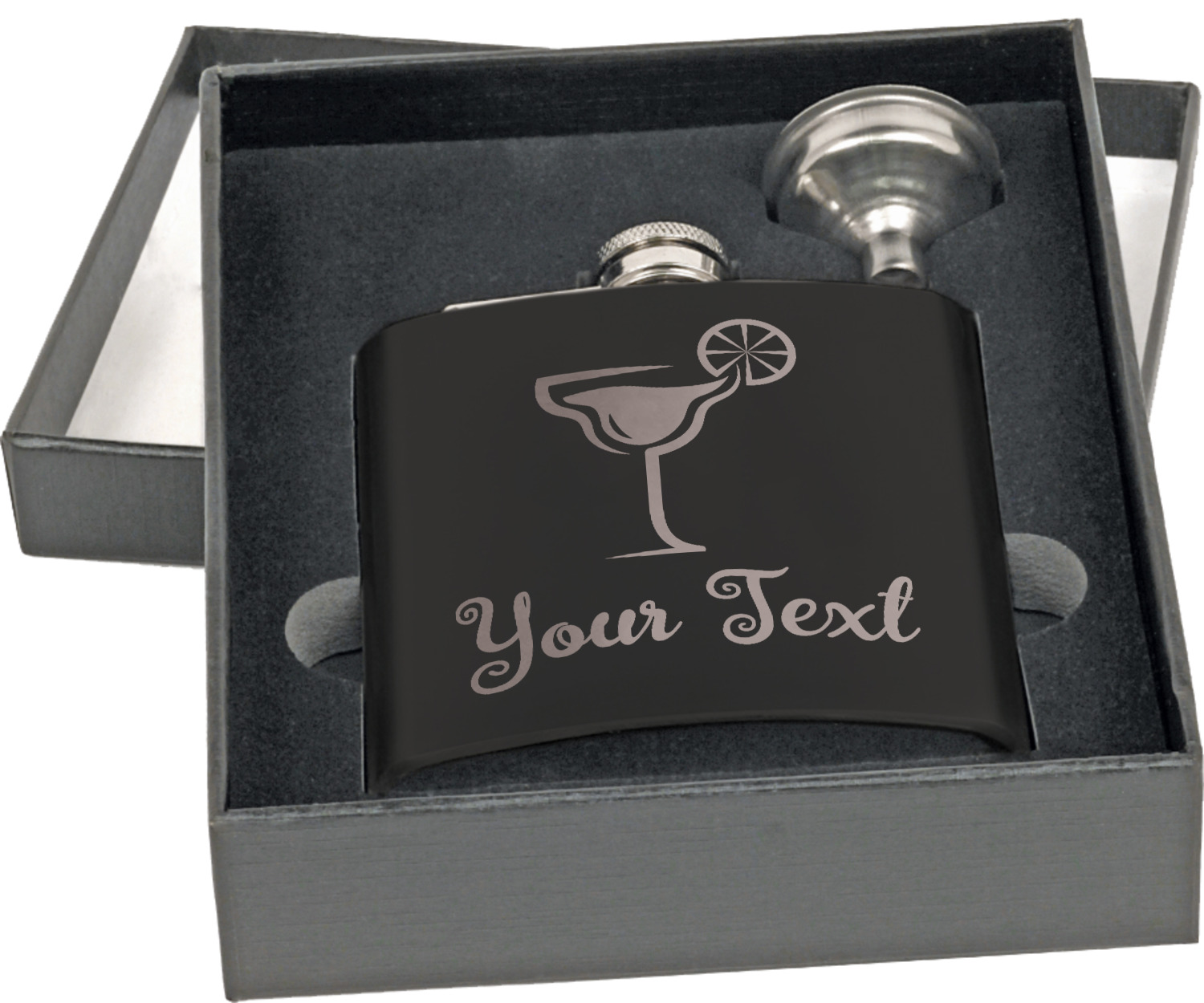Built from a stainless steel and then covered with a black coating, this hip flask, has a very classy appearance. Similar to the standard flask, this stainless steel flask has the traditional curved shape for a snug fit in your palm. This flask set also includes a traditional screw and flip lid and liquid funnel in a gift box. At 4 by 4.5 inches, this flask can hold up to 6 ounces. Your personalized design is laser-engraved across the front of this flask.