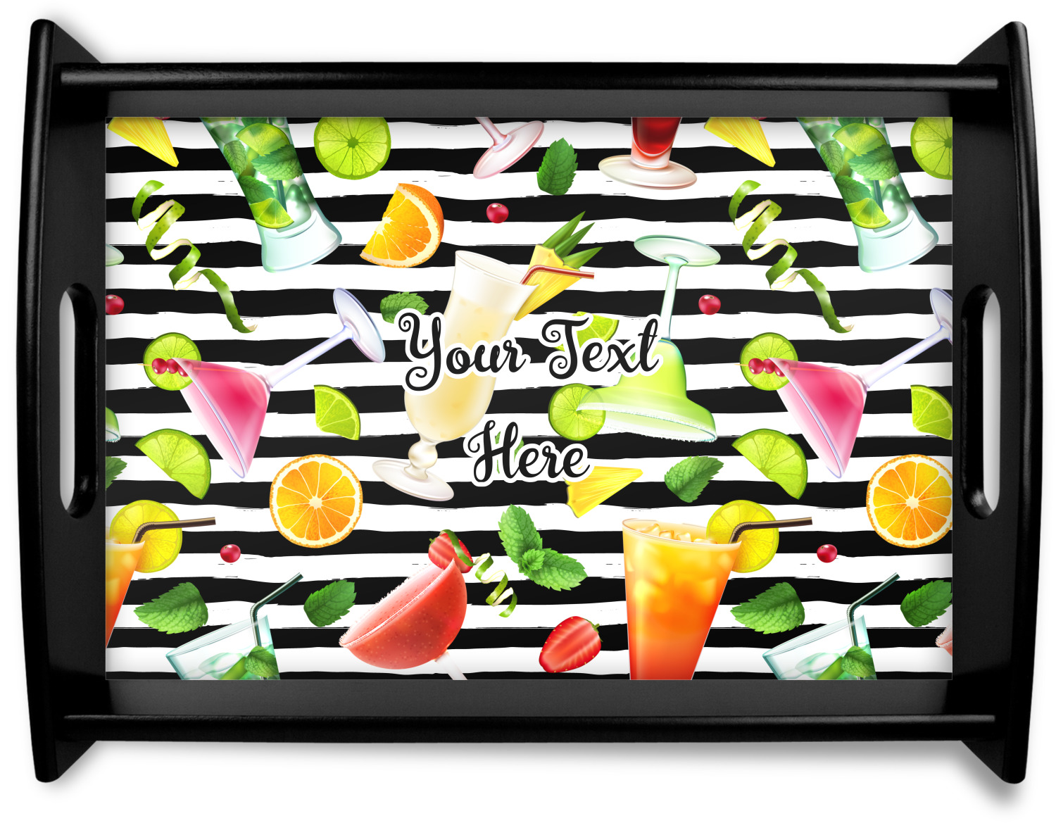This serving tray with handles features square edges and two rounded sides, creating a very modern look. Each side is fabricated from a beautifully cut, natural wood. The bottom of the interior of the tray displays your customized design in bright, vibrant color. The tray is sold in both a black color and a natural wood look. Each variation of the wood serving tray has two sizes: Small, which is 14" x 10" x 2.25", and Large, which is 19.5" x 13.5" x 2.75".