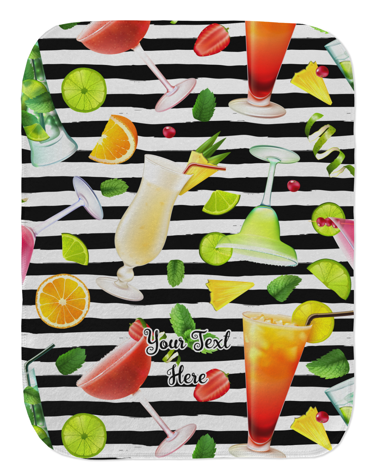 This design has gorgeous illustrations of several different kinds of mixed drinks from mojitos to margaritas. They're are a variety of colors like pink, orange, green, yellow, black, and white. Behind the cocktails is a fun striped pattern giving it a bit of pizazz. You are able to personalize the text with a name, monogram, or whatever you like.