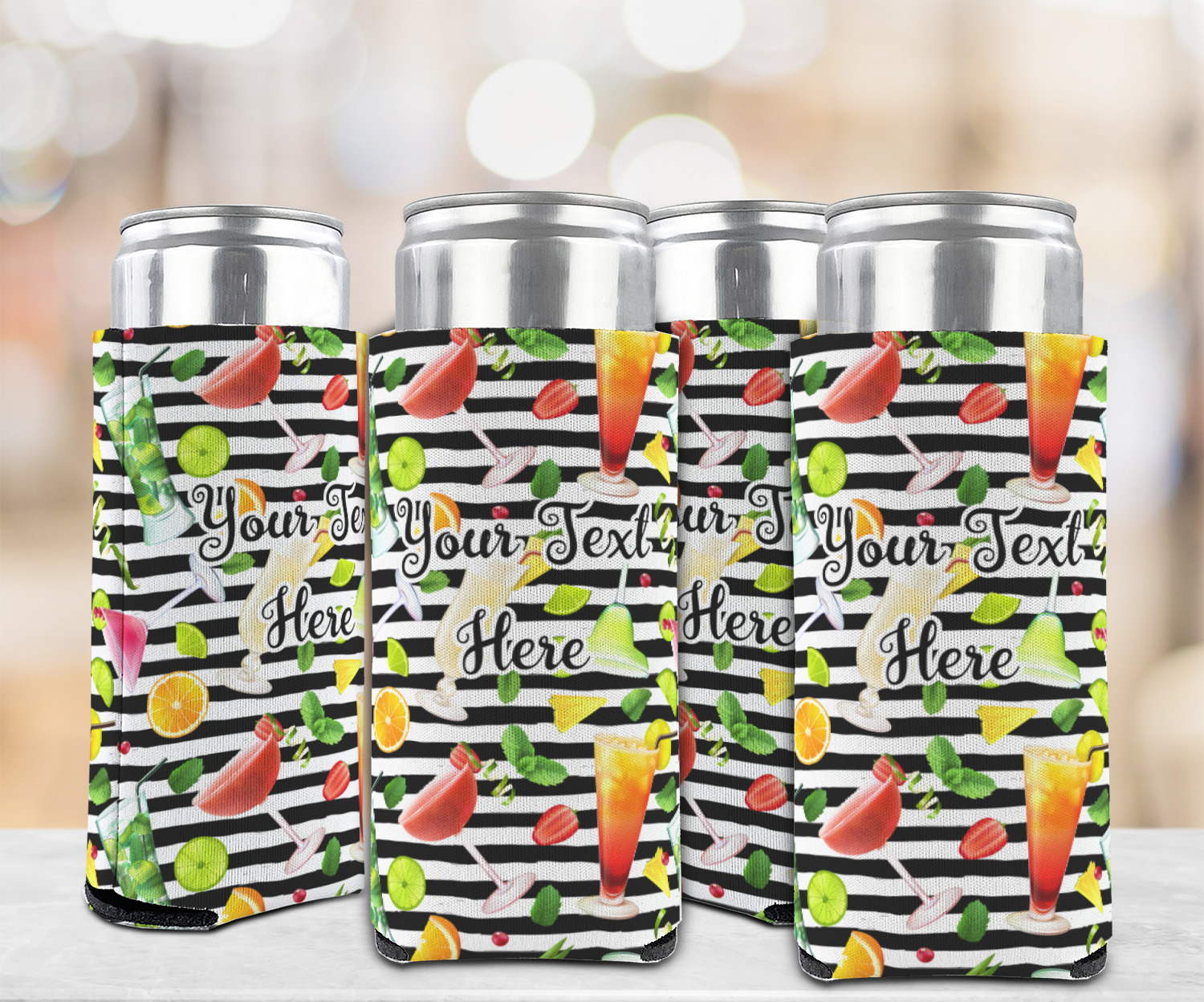 This design has gorgeous illustrations of several different kinds of mixed drinks from mojitos to margaritas. They're are a variety of colors like pink, orange, green, yellow, black, and white. Behind the cocktails is a fun striped pattern giving it a bit of pizazz. You are able to personalize the text with a name, monogram, or whatever you like.
