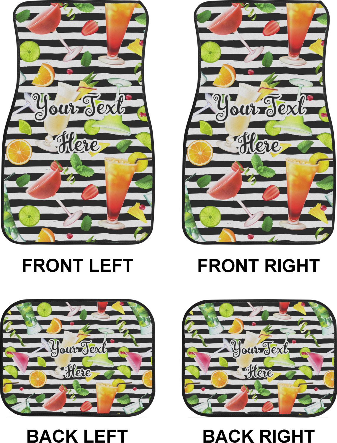 We craft our auto floor mats mats from polyester, apply a black finish to the edges, and lined at the bottom to prevent slippage. These mats protect your floors from grass, mud, and any accidental spills. We display your personalized design on the front face of each mat. The sizes of these car floor liners are standardized to provide a versatile fit for all vehicles. The front rows car mats measure at 17 by 26.5 inches, while the back rows measure at 17 by 13 inches. We sell three packages of car floor mats. You can purchase a pair of front row car mats, a pair of back row car mats, or a set of front row and back row car mats. To make an informed purchase, we recommend measuring the surface area of your car floors.