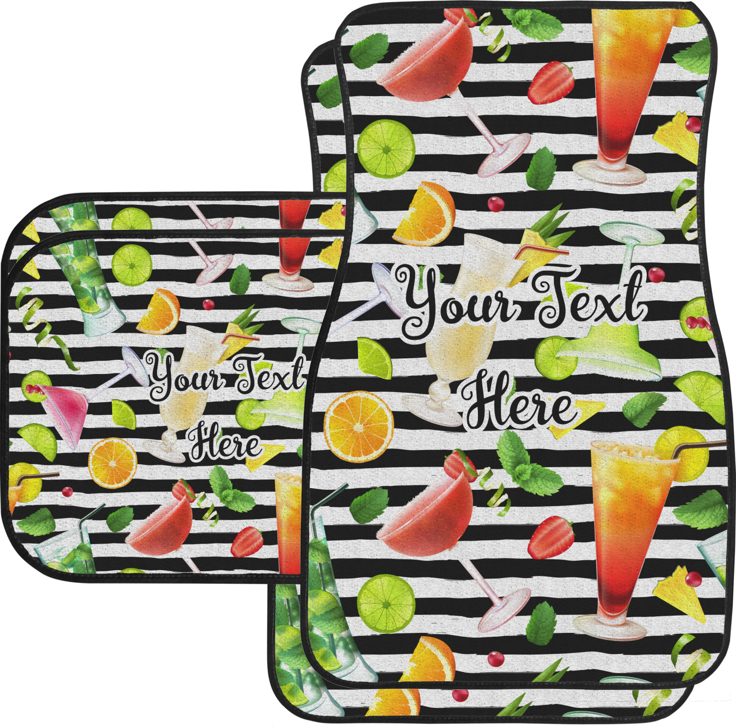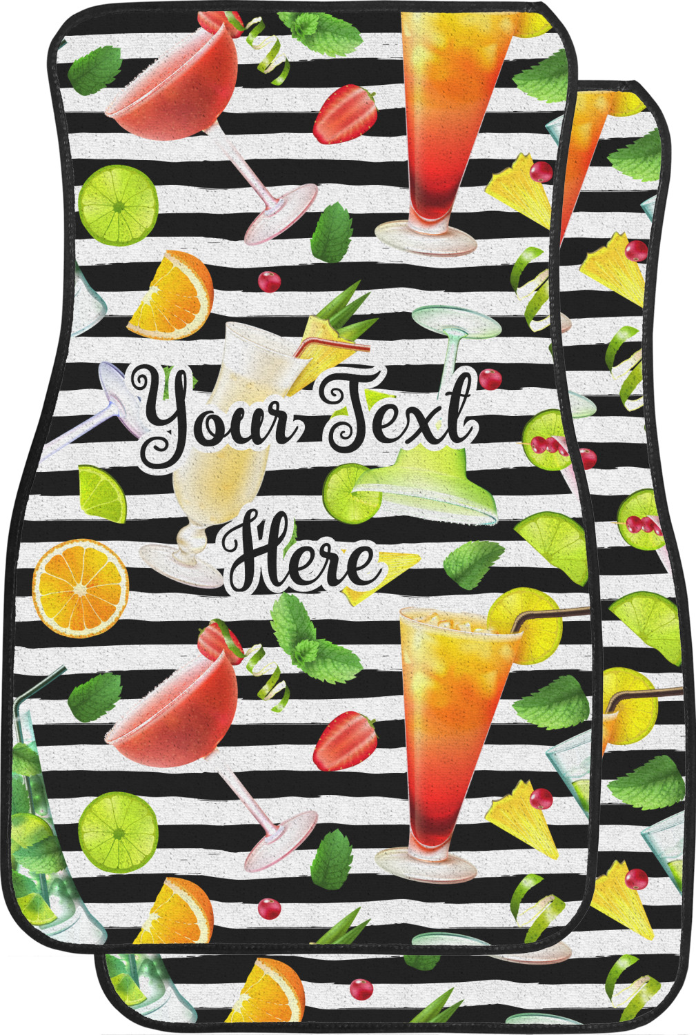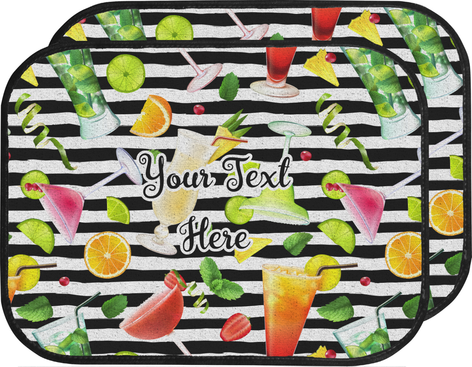 This design has gorgeous illustrations of several different kinds of mixed drinks from mojitos to margaritas. They're are a variety of colors like pink, orange, green, yellow, black, and white. Behind the cocktails is a fun striped pattern giving it a bit of pizazz. You are able to personalize the text with a name, monogram, or whatever you like.