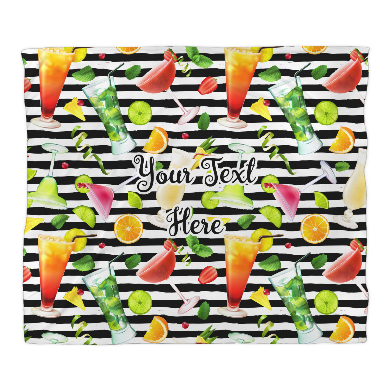 This design has gorgeous illustrations of several different kinds of mixed drinks from mojitos to margaritas. They're are a variety of colors like pink, orange, green, yellow, black, and white. Behind the cocktails is a fun striped pattern giving it a bit of pizazz. You are able to personalize the text with a name, monogram, or whatever you like.