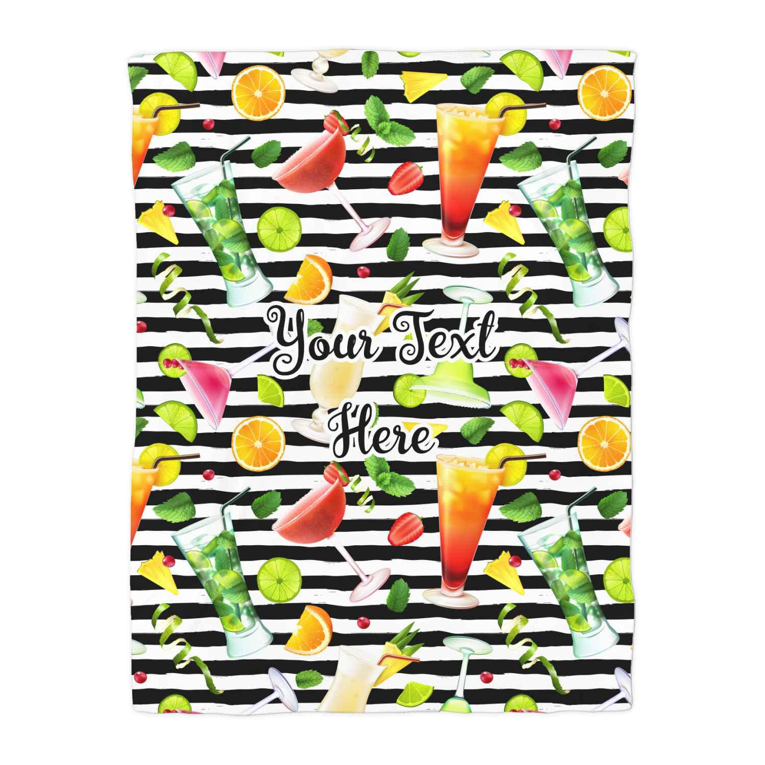 This design has gorgeous illustrations of several different kinds of mixed drinks from mojitos to margaritas. They're are a variety of colors like pink, orange, green, yellow, black, and white. Behind the cocktails is a fun striped pattern giving it a bit of pizazz. You are able to personalize the text with a name, monogram, or whatever you like.