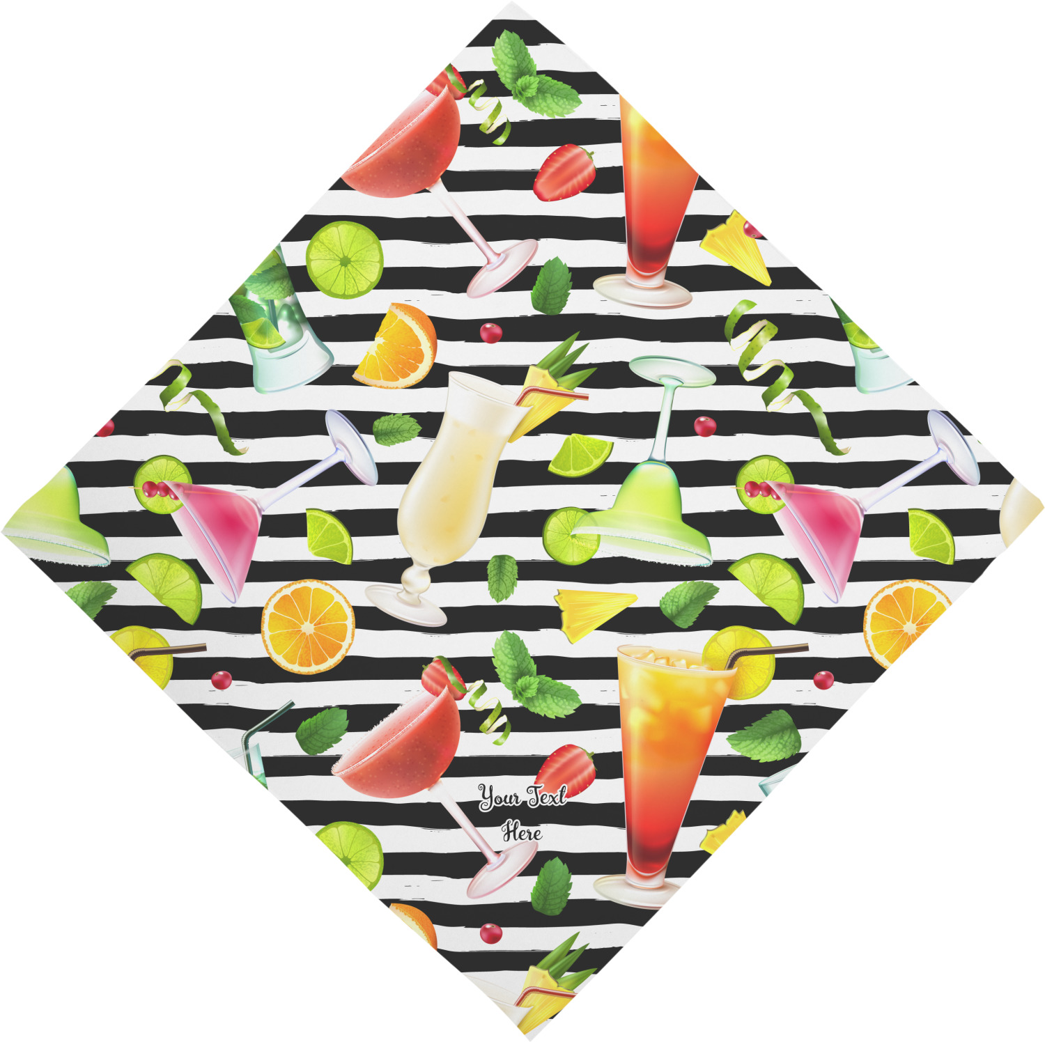 This design has gorgeous illustrations of several different kinds of mixed drinks from mojitos to margaritas. They're are a variety of colors like pink, orange, green, yellow, black, and white. Behind the cocktails is a fun striped pattern giving it a bit of pizazz. You are able to personalize the text with a name, monogram, or whatever you like.