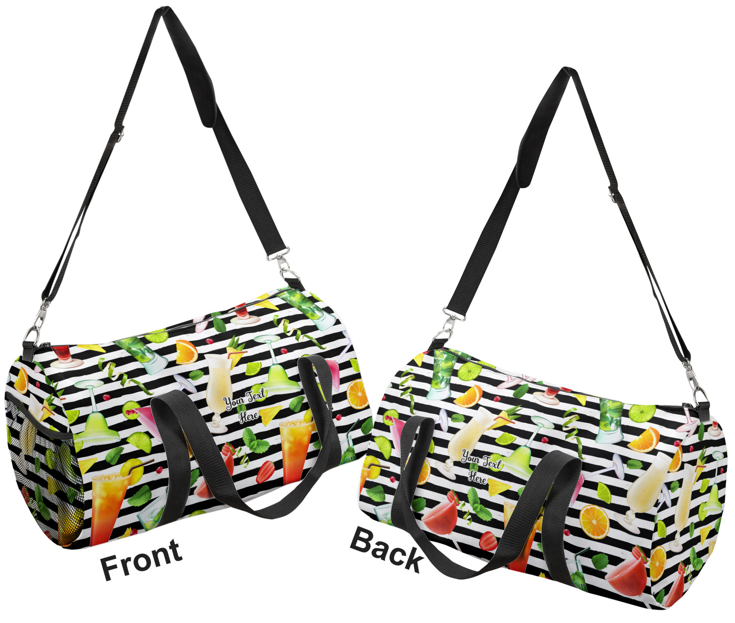 This duffle is a sturdy bag made of a canvas material. It comes in two sizes: Small (19"W x 9.5"H x 9.5"D) and Large (23"W x 12"H x 12"D). The bag is a cylindrical shape with a black adjustable strap and two handles. On one side is an elastic pouch to put a waterbottle or other small item. Your product will be sublimated with your design and is able to be designed on the front, back, and sides. Be sure to remember that the straps may cut into parts of your design if you upload your own artwork.