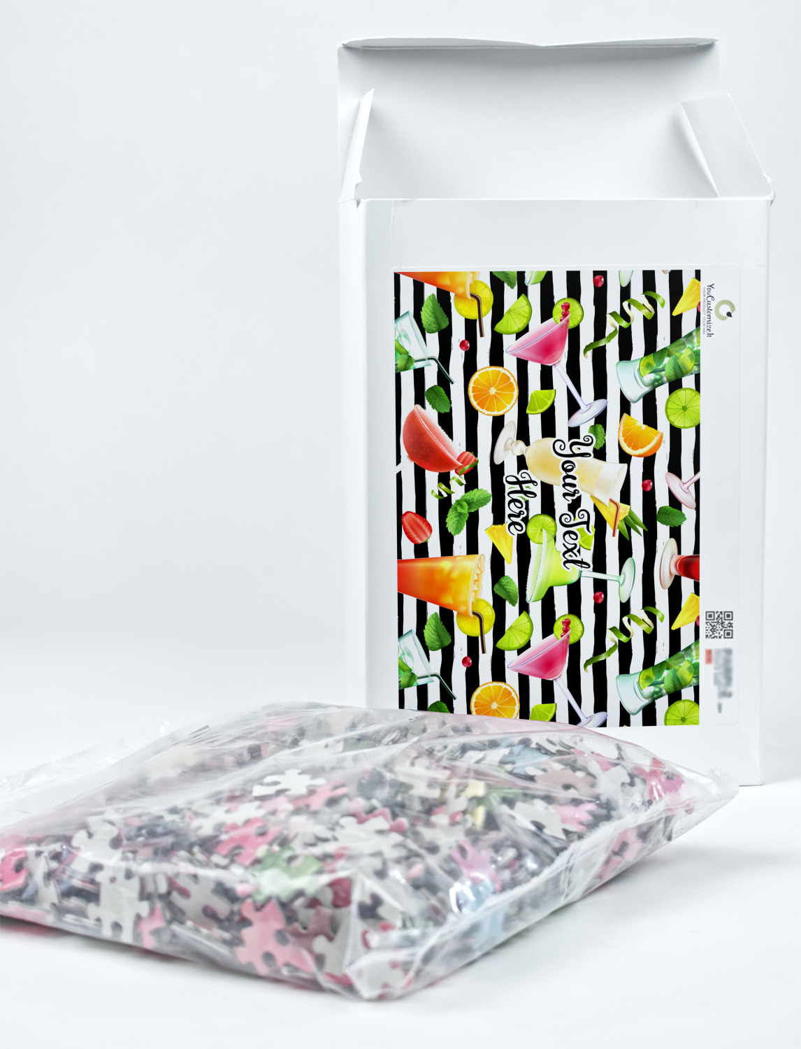 Depending on the look you are trying to achieve, you can add; a thematic pattern or background, with a photo in a frame and text or personalization to your puzzle. Basically if you can imagine it, you can design it!