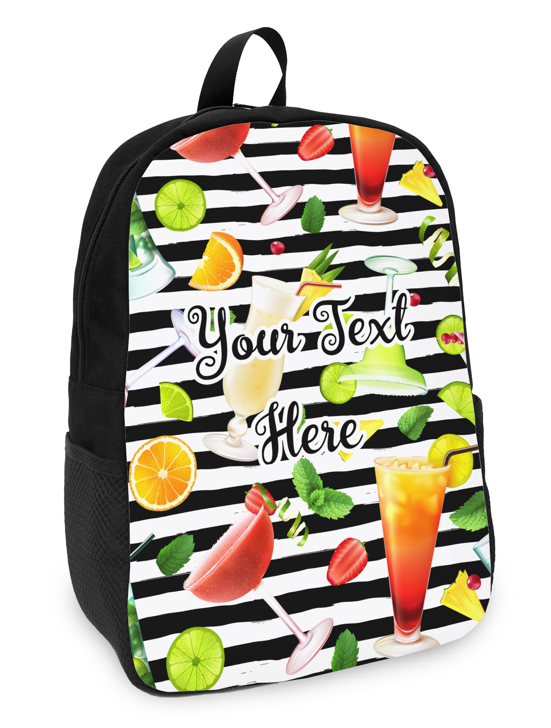 This design has gorgeous illustrations of several different kinds of mixed drinks from mojitos to margaritas. They're are a variety of colors like pink, orange, green, yellow, black, and white. Behind the cocktails is a fun striped pattern giving it a bit of pizazz. You are able to personalize the text with a name, monogram, or whatever you like.